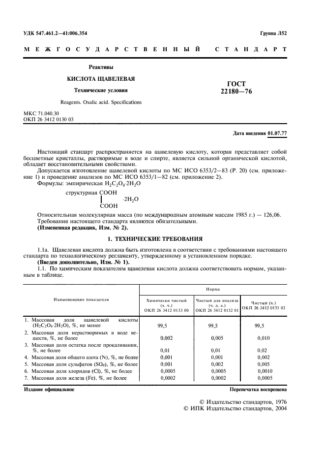| Название рус.: | Реактивы. Кислота щавелевая. Технические условия |