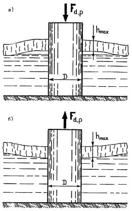 где sс - сдельное напряжение в сжатом слое изгибаемого ледяного покрова, МПа, определяемое как (С + D) для нижнего слоя ледяного покрова при температуре tb в случае понижения уровня воды или - для верхнего слоя ледяного покрова при температуре tu в случае повышения уровня воды; st - предельное напряжение в растянутом слое изгибаемого ледяного покрова, МПа, определяемое как 0,3(С + D) для верхнего слоя ледяного покрова при температуре tu в случае понижения уровня воды или - для нижнего слоя ледяного покрова при температуре tb в случае повышения уровня воды; C, D, tu и tb - обозначения те же, что в п. 5.2. 5.17. Вертикальную силу на отдельно стоящую опору или свайный куст от примерзшего к сооружению ледяного покрова при изменении уровня воды Fd,p, МН, рис. 42, необходимо определять по формуле Fd,p = kfRfh2max, (144) где kf - коэффициент, определяемый по формуле kf = 0,6 + 0,15D/hmax, (145) где D - поперечный размер (диаметр) опоры или свайного куста, м; Rf и hmax - обозначения те же что в пп. 5.2 и 5.15. Примечание.