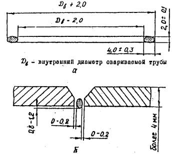 Черт. 2 2.2.2. Огневая резка труб и обработка кромок допустима для труб из сталей марок 1 и 2 групп и аналогичных (обязательное приложение 1). 2.2.3. Огневую резку труб на монтаже из сталей 3 группы (обязательное приложение 1) и аналогичных можно производить и исключительных случаях. Перед огневой обработкой участок трубы, примыкающий к резу, должен быть подогрет до 300 - 350°С. После резки следует обеспечить медленное охлаждение кромок трубы, которые затем должны быть зачищены наждачным кругом на глубину не менее 3 мм (считая от максимальной впадины реза) и тщательно проконтролированы на отсутствие трещин (на ширину не менее 20 мм) методом цветной дефектоскопии по ГОСТ 18442-72. 2.2.4. Допускается плазменная и воздушно-дуговая резка труб из сталей 4, 5 и 6 групп (обязательное приложение 1), после чего должна быть произведена механическая зачистка поверхности реза на глубину не менее 1 мм. При обнаружении трещин глубину зачистки кромок необходимо увеличить (до полного удаления трещин). 2.2.5. Сборку стыка трубопровода необходимо производить в условиях надежной защиты от ветра и попадания на стык атмосферных осадков и грязи. 2.2.6. При отсутствии специальных указаний на чертежах проекта угол разделки и притупление следует выполнять в соответствии с ГОСТ 16037-80. 2.2.7. Перед сборкой труб под сварку необходимо проверить правильность подготовки фасок и зачистить до металлического блеска кромки стыкуемых труб. Наружная поверхность кромок трубы (на расстоянии 30 - 40 мм от торца) и внутренняя (на 20 - 30 мм) должны быть зачищены от грязи, масла и окалины. 2.2.8. Сборку стыков труб под сварку необходимо производить либо в специальных сборочных приспособлениях, либо с использованием центровочных приспособлений любой конструкции, обеспечивающих расположение осей стыкуемых труб на одной линии. 2.2.9. Несовпадение кромок (по внутреннему диаметру) при сборке стыков труб не должно превышать 10% толщины стенки, а для труб с толщиной стенки более 20 мм - не превышать 2 мм. При наличии разности толщины стенок стыкуемых труб, превышающей указанные величины, плавный переход от более толстого элемента к более тонкому должен быть обеспечен посредством соответствующей обработки. При этом толщина стенки трубы в любом месте разделки не должна выходить за пределы допусков по толщине. 2.2.10. Прямолинейность оси и смещение кромок стыкуемых частей трубопровода необходимо проверять линейкой длиной 400 мм, прикладываемой в трех местах по окружности стыка. По оси, трубы зазор между концом линейки и трубой не должен превышать 1 мм. 2.2.11. Правка и доводка стыкуемых труб путем нагрева стенок не допускаются. 2.2.12. Разделку, кромок при сварке стыка из труб разных сталей необходимо подбирать по более легированной стали. 2.2.13. Сборку стыка между трубопроводом и запорной apмaтурой следует производить с применением расплавляемой вставки. Размеры расплавляемой вставки должны соответствовать черт. 3,а, а размеры стыкового соединения с применением расплавляемой вставки - черт. 3,б. Схема сварки стыка с расплавляемой вставкой