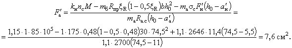 Поскольку x > xRh0 = 0,48×74,5 = 35,8 см, поставим сжатую ненапрягаемую арматуру (см. п. 11.14, в), определив ее площадь по формуле (223) при a'а = 11 см: