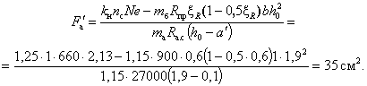 ξ = x/h0 = 10,1/185 = 0,05 < ξR = 0,6 (табл. 20). Так как x = 10,1 см < 2а' = 30 см, площадь сечения растянутой арматуры определяется из условия (23) без учета сжатой арматуры: