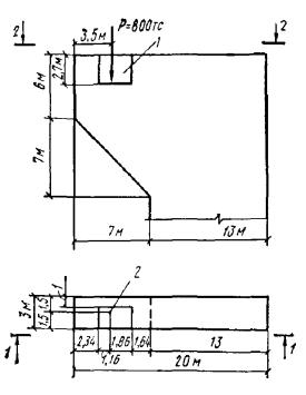 Для прямоугольного сечения bh2/6 = Wр; 1,75 = g по прил. 4, т.е. 1,75bh2/6 = gWр = Wт. Таким образом, в предельном состоянии с учетом расчетных коэффициентов получаем формулу (6) - kнnсM = mhmбRрWт. Пример 5. Дано. Элемент бетонной конструкции (mб = 0,9) с сечением b = 1 м, h = 2 м (рис. 5); класс III - kн = 1,15; бетон марки М 200, Rпр = 90 кгс/см2; q = 25,2 тс/м (боковое давление грунта qн = 21 тс/м; n = 1,2 - коэффициент перегрузки); сочетание нагрузок основное - nс = 1; элемент не подвержен действию агрессивной воды и не воспринимает напор воды. Продольный изгиб конструкции возможен только в плоскости чертежа. Требуется проверить прочность сечения 1-1. Расчет. Из статического расчета элемента как рамы с жесткими вставками находим для сечения 1-1 M = 134 тс·м; Nс = 151 тс (сечение внецентренно сжато). Отсюда эксцентрицитет продольной силы N относительно центра тяжести сечения 1-1