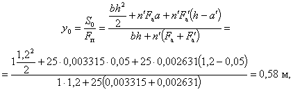 ξ = x/h0 = 0,11/5,85 = 0,019 < ξR = 0,6 (табл. 20). Так как x = 0,11 м < 2а' = 0,3 м, площадь сечения растянутой арматуры определяется без учета сжатой арматуры из условия
