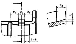 Примечания 1 b1 ≥ 1,5s3, но не менее 3 мм. 2 Если b3 < 2 мм, то эта поверхность может быть свободна от подшипникового (антифрикционного) металла в пределах кольцевой длины а2, чтобы избежать разрушения подшипникового металла, когда отверстие вкладыша подвергают механической обработке. Фиксирующий выступ может также разрушиться в смазочной канавке Рисунок 6 - Фиксирующий выступ в тонкостенном буртовом вкладыше