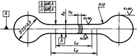 толщиной 3,0 мм и более от для цилиндрических образцов - от l0 + 0,5d0 до l0 + 2d0. В случаях разногласий в оценке качества труб рабочая длина образцов должна быть наибольшей. Для образцов, приведенных на черт. 1, 2 и 3, общая длина образцов (Lобщ) в зависимости от размеров рабочего пространства lн применяемого нагревательного устройства должна быть Lобщ ³ lн + 80. 1.7. Предельные отклонения по размерам рабочей части образцов должны соответствовать указанным в табл. 2. Таблица 2 мм