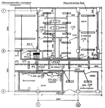 классы взрывоопасных и пожароопасных зон, категорию и группу взрывоопасных смесей для взрывоопасных зон по Правилам устройства электроустановок*; нормируемую освещенность от общего освещения (за исключением жилых помещений)*; светильники (в жилых домах - места их установки) их количество (при необходимости) типы *; количество и мощность ламп в светильниках*; высоту установки светильников (кроме потолочных)*; привязочные размеры для светильников или рядов светильников к элементам строительных конструкций или координационным осям здания (сооружения). Привязочные размеры допускается не проставлять, если места установки светильников ясны без указания привязочных размеров или если привязочные размеры приведены на чертежах интерьеров. В этом случае должна быть дана ссылка на соответствующие чертежи; комплектные распределительные устройства на напряжение до 1000 В, относящиеся к питающей сети (распределительные щиты, щиты станций управления, распределительные пункты, ящики и шкафы управления, вводно-распределительные устройства) и их обозначения; групповые щитки и их обозначения; понижающие трансформаторы; выключатели, штепсельные розетки (в жилых домах - включая розетки для электроплит и других бытовых электроприемников); линии питающей, групповой сети и сети управления освещением (в жилых домах - включая линии для электроплит и других бытовых электроприемников), их обозначения, сечение и, при необходимости, марку и способ прокладки*; другое электрическое оборудование, относящееся к внутреннему освещению. ___________ * Порядок записи условных обозначений указанных данных приведен в рекомендуемом приложении 1. 2.4.4. При большом числе линий питающей сети, групповой сети и сети управления освещением указанные сети и относящееся к ним электрическое оборудование допускается изображать на отдельных листах и в разных масштабах. 2.4.5. Электрическое оборудование и проводки на планах расположения указывают условными графическими изображениями по ГОСТ 2.754-72 и дополнительными условными графическими изображениями, приведенными в обязательном приложении 2. Пример оформления плана расположения для производственного здания приведен на черт. 1, для общественного здания - на черт. 2. Черт. 1