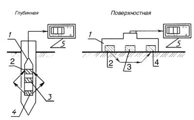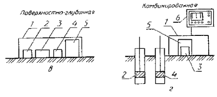 1 - измерительный преобразователь; 2 - детектор; 3 - радиоизотопный (нуклид) источник; 4 - измерительный прибор Черт. 2 2.9. При измерениях влажности грунта нейтронным методом применяют следующие схемы измерений (черт. 3): глубинную (скважинную) - измерительный преобразователь с источником нейтронов помещают в скважину по ее центру для измерения влажности грунта в радиусе вокруг измерительного преобразователя от 200 до 250 мм при объемной влажности (Wоб) 40 - 45 % и в радиусе до 450 мм при Wоб £ 5 %; поверхностную - измерительный преобразователь и источник нейтронов помещают на поверхности грунта для измерения влажности грунта в слое толщиной до 150 мм под измерительным преобразователем; поверхностно-глубинную - измерительный преобразователь и источник нейтронов прижимают к боковой поверхности скважины или обсадной трубы для измерения влажности в слое толщиной до 150 мм под измерительным преобразователем; комбинированную - измерительный преобразователь помещают на поверхности грунта, а источник нейтронов в грунте - для измерения влажности грунта в слое между источником нейтронов и измерительным преобразователем. 2.10. При одновременном измерении плотности и влажности грунта радиоизотопными влагоплотномерами применяют следующие схемы измерений (черт. 4): глубинную (скважинную) - измерительный преобразователь, содержащий детектор (детекторы) для одновременной или раздельной регистрации плотности потока гамма-излучения и замедленных нейтронов и источники гамма-излучения и медленных нейтронов, помещают в скважину по ее центру для измерения плотности грунта по п. 2.5 и влажности по п. 2.9; поверхностную - измерительный преобразователь устанавливается на поверхности грунта для измерения плотности и влажности грунта в слое толщиной до 150 - 200 мм под измерительным преобразователем; поверхностно-глубинную - измерительный преобразователь прижимают к боковой поверхности скважины или обсадной трубы для измерения плотности в слое толщиной до 120 мм и влажности грунта в слое толщиной до 150 мм под измерительным преобразователем; комбинированную - измерительный преобразователь помещают на поверхности грунта, а источники нейтронов и гамма-излучения погружают поочередно в грунт для измерения плотности и влажности грунта в слое между измерительным преобразователем и источником ионизирующего излучения. Схемы измерений нейтронными влагомерами