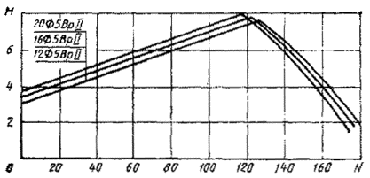 7. Если точка с координатами М и N лежит ниже линии, соответствующей принятому армированию свай, то выбранная свая удовлетворяет расчету по прочности, раскрытию или образованию трещин (для соответствующей продольной арматуры) на эксплуатационные нагрузки М и N, если точка лежит выше - не удовлетворяет.
