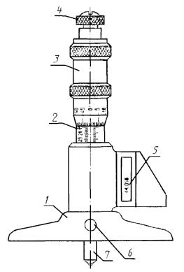 Дата введения 01.01.93 Настоящий стандарт распространяется на микрометрические глубиномеры (далее - глубиномеры), предназначенные для измерения глубины пазов и высоты уступов до 300 мм. Требования пп. 1.8; 1.9; 2.2 - 2.4; 2.6; 2.8 - 2.11.3; 2.12; 2.17; 2.18 и 4.1 настоящего стандарта являются обязательными, другие требования - рекомендуемыми. 1. ОСНОВНЫЕ ПАРАМЕТРЫ И РАЗМЕРЫ1.1. Глубиномеры следует изготовлять: с отсчетом по шкалам стебля и барабана (ГМ) (черт. 1); с отсчетом по электронному цифровому устройству (далее - цифровое устройство) и шкалам стебля и барабана (ГМЦ) (черт. 2). 1.2. Диапазон измерений глубиномеров, мм, типа: ГМ25 и ГМЦ25 - от 0 до 25 мм; ГМ50 и ГМЦ50 - от 0 до 50 мм; ГМ75 и ГМЦ75 - от 0 до 75 мм; ГМ100 и ГМЦ100 - от 0 до 100 мм; ГМ150 и ГМЦ150 - от 0 до 150 мм; ГМ300 - от 0 до 300 мм. 1.3. Цена деления шкалы барабана глубиномера - 0,01 мм.. 1.4. Шаг дискретности цифрового устройства - 0,001 мм, 1.5. Длина и ширина основания - не более 100´25 мм. 1.6. Шаг микрометрического винта - 0,5 мм. Измерительное перемещение микрометрического винта - 25 мм. 1.7. Диаметр измерительного стержня - не более 5 мм. 1.8. Измерительное усилие глубиномера - от 3 до 7 Н. Колебание измерительного усилия в пределах указанного диапазона измерений глубиномера - не более 2 Н. 1.9. Глубиномеры типа ГМЦ должны обеспечивать выполнение функций, характеризующих степень автоматизации, в соответствии с перечнем, приведенным в приложении. 1.10. Глубиномеры типа ГМЦ следует изготовлять с встроенным цифровым устройством или с выводом результата измерения на внешние устройства. 1 - основание; 2 - стебель; 3 - барабан; 4 - трещотка (фрикцион); 5 -стопор; 6 - измерительный стержень Черт. 1 1 - основание; 2 - стебель; 3 - барабан; 4 - трещотка (фрикцион); 5 - табло цифрового устройства; 6 - стопор; 7 - измерительный стержень Черт. 2 Примечание к черт. 1, 2. Чертежи не определяют конструкцию глубиномеров. 1.11. Электрическое питание глубиномеров типа ГМЦ с встроенным цифровым устройством должно быть от автономного встроенного источника питания. Электрическое питание глубиномеров, имеющих вывод результата на внешние устройства, - от автономного встроенного источника питания и (или) от сети общего назначения через блок питания. 1.12. Глубиномеры с верхним пределом измерения до 150 мм следует изготовлять классов точности 1 и 2, а свыше 150 мм - класса точности 2. Пример условного обозначения глубиномера с отсчетом по шкалам стебля и барабана при диапазоне измерения от 0 до 100 мм класса точности 2: Глубиномер ГМ100-2 ГОСТ 7470-92 То же, глубиномера с цифровым устройством при диапазоне измерения от 0 до 150 мм класса точности 1: Глубиномер ГМЦ150-1 ГОСТ 7470-92 2. ТЕХНИЧЕСКИЕ ТРЕБОВАНИЯ2.1. Глубиномеры следует изготовлять в соответствии с требованиями настоящего стандарта по конструкторской документации, утвержденной в установленном порядке. 2.2. Предел допускаемой погрешности глубиномеров (в пределах перемещения микрометрического винта) при температуре окружающей среды (20 ± 5) °С и нормируемом измерительном усилии, а также при зажатом или отпущенном стопоре должен соответствовать указанному в табл. 1. Таблица 1