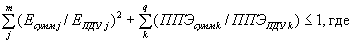 Ei - напряженность электрического поля, создаваемая источником ЭМП под i-тым номером; ППЭi - плотность потока энергии, создаваемая источником ЭМП под i-тым номером; Есумм. - «суммарная» напряженность электрического поля, под которой понимается энергетически эквивалентная напряженность суммарного поля; ЕПДУ - ПДУ напряженности электрического поля нормируемого диапазона; ППЭПДУ - ПДУ плотности потока энергии нормируемого диапазона; ППЭсумм. - суммарная плотность потока энергии; п - количество источников ЭМП. При одновременном облучении от нескольких источников ЭМП, для которых установлены разные ПДУ, должны соблюдаться следующие условия: