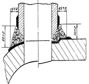 Основной является конструкция штуцерного соединения без остающегося подкладного кольца. Допускается конструкция с подкладным цилиндрическим кольцом, которое после термического отдыха сварного соединения рекомендуется удалять механическим способом (шлифованием, фрезерованием). Подкладное кольцо может быть изготовлено точеным или вальцованным из полосы или трубной заготовки; материал кольца - сталь 12Х1МФ или 20. Рис. 13.3. Зона перехода от штуцера к коллектору (относится к рис. 13.2) 13.6.2. Усиливающие наплавки на штуцер и коллектор наносят кольцевыми валиками шириной 12 - 16 мм и высотой 3 - 5 мм в два слоя (рис. 13.4 и 13.5). Сварку выполняют электродами диаметром 3 мм силой тока 90 - 110 и 100 - 120 А для наплавки на штуцер и коллектор соответственно и с подогревом 200 - 250 и 250 - 300 °С для штуцера и коллектора соответственно. Способ нагрева любой. Регистрация температур - с помощью термокарандашей или термопар с приборами (милливольтметром, потенциометром). После сварки поверхность наплавки подвергают механической обработке (шлифованию) до получения требуемых размеров и форм (рис. 13.4 и 13.5; табл. 13.2). Качество сварки оценивается по результатам макроанализа визуальным способом с применением лупы 4 - 7-кратного увеличения поверхности наплавки травленной 15 % водным раствором азотной кислоты; нормы допустимых дефектов соответствуют РД 34 15.027-93. Рис. 13.4. Схема нанесения усиливающей наплавки электродами Э-09Х1М на тело штуцера: а - подготовленный под наплавку штуцер; б - последовательность двухслойной наплавки кольцевыми валиками; в - форма усиливающей наплавки после механической обработки (размеры см. в табл. 13.2) Рис. 13.5. Схема нанесения усиливающей наплавки электродами Э-09Х1М на тело коллектора 13.6.3. В собранных под сварку деталях кольцевой зазор в корневой части должен составлять 3 - 4 мм для штуцера без подкладного кольца (рис. 13.6) и 5 - 8 мм - для штуцера с подкладным цилиндрическим кольцом (рис. 13.7). Собранные элементы скрепляют двумя прихватками длиной по 40 - 50 мм и высотой 4 - 6 мм, располагающимися в диаметрально противоположных местах по периметру кольцевого зазора. Прихватки выполняют электродами диаметром 3 мм, ток при сварке - 90 - 110 А с подогревом деталей при температуре 250 - 300 °С. Способ нагрева любой: контроль температур осуществляют согласно рекомендациям п. 13.6.2 настоящего РД. Рис. 13.6. Собранные под сварку элементы штуцерного соединения без подкладного остающегося кольца. Усиливающие наплавки выполнены электродами Э-09Х1М Рис. 13.7. Собранные под сварку элементы штуцерного соединения с подкладным цилиндрическим кольцом. Усиливающие наплавки выполнены электродами Э-09Х1М 13.6.4. Угловой шов выполняется многослойным способом (рис. 13.8) кольцевыми валиками шириной по 12 - 18 мм и высотой 6 - 8 мм с использованием электродов типа Э-09Х1М диаметром 3 и 4 мм на режимах тока 100 - 120 к 140 - 180 А соответственно; заполнение разделки обеспечивается по всему сечению с получением усиления шва высотой около 15 - 20 мм. Рис. 13.8. Схема последовательности заполнения разделки и усиления углового шва кольцевыми валиками с помощью электродов Э-09Х1М 13.6.5. При сварке должен быть обеспечен предварительный и сопутствующий подогрев свариваемых деталей при температуре 250 - 300 °С. Зона равномерного подогрева включает полностью тело штуцера и кольцевой участок коллектора шириной 400 - 500 мм по всему периметру