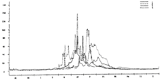 Гидрографы р. Волги - г. Старица. 1 - гидрограф 1971-72 г., 2 - средний по водности 1942-43 гг., 3 - близкий к маловодному 1938-39 гг., 4 - близкий к многоводному 1954-55 гг.