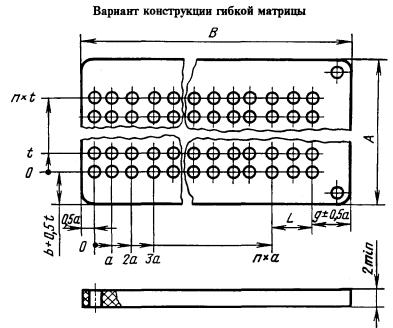 Дата введения 01.07.80 1. Настоящий стандарт распространяется на монтаж электрический, выполняемый внутри радиоэлектронной аппаратуры и приборов (далее - аппаратура), отвечающие требованиям нормативной документации (НД). 2. Стандарт устанавливает технические требования к электромонтажу, выполненному с применением гибких матриц. Стандарт не распространяется на технические требования, предъявляемые к электромонтажу аппаратуры на печатных платах. 3. В случаях предъявления к электромонтажу дополнительных требований, не предусмотренных НД и настоящим стандартом, они указываются в конструкторской документации и согласовываются с заказчиком. 4. Гибкие матрицы следует применять для раскладки и крепления проводов в аппаратуре; определение минимальных габаритных размеров и примеры конструкций приведены в рекомендуемом приложении 1. Термины и их определения приведены в справочном приложении 2. 5. Материалы, применяемые для гибкой матрицы, приведены в рекомендуемом приложении 3. Применение материалов, содержащих серу, не допускается. 6. Для прошивки матриц следует применять монтажные провода сечением не более 0,2 мм2. Применение проводов с однопроволочной жилой не допускается. Монтажные провода приведены в рекомендуемом приложении 4. 7. Прошивку матриц следует производить одиночными монтажными проводами или набором нескольких монтажных проводов. Прошивку матрицы при различных диаметрах проводов следует производить по возможности в отдельных трассах для каждого из диаметра проводов. Не рекомендуется прошивать гибкие матрицы экранированными проводами. Пример прошивки гибкой матрицы монтажными проводами приведен в рекомендуемом приложении 5. Смонтированные гибкие матрицы ремонтопригодны. 8. Крепление монтажных проводов при продольной и поперечной прошивке гибкой матрицы осуществлять за счет образования петель-замков или изоляционными трубками (например, из фторопласта 4Д диаметром 0,3; 0,5; 0,6 мм). Крепление монтажных проводов к матрице осуществлять в соответствии с требованиями, установленными в конструкторской документации. (Измененная редакция, Изм. № 1). 9. Диаметр отверстий в матрице следует выбрать большим или равным диаметру набора из проводов, проходящих через одно отверстие. Диаметр набора следует определять по номограмме, приведенной в рекомендуемом приложении 6. Провода в матрице должны быть уложены ровно, без натяжения, так, чтобы внутренний радиус изгиба матрицы, прошитой монтажными проводами, был не менее трех диаметров наибольшего набора, проходящего через отверстие матрицы. Внутренний радиус изгиба проводов в процессе прошивки матрицы должен быть не менее значения, указанного в стандартах и технических условиях на провода. 10. При прошивке матрицы допускаются отдельные прорывы перемычек между отверстиями не более 2 % к общему количеству отверстий. Допускается не более одного прорыва из всех возможных перемычек к одному отверстию. 11. Примеры крепления гибкой матрицы к ячейке и в блоке приведены в справочном приложении 7. ПРИЛОЖЕНИЕ 1Рекомендуемое ОПРЕДЕЛЕНИЕ МИНИМАЛЬНЫХ ГАБАРИТНЫХ РАЗМЕРОВ ГИБКОЙ МАТРИЦЫМинимальные габаритные размеры гибкой матрицы, приведенные на черт. 1, 2, определяются максимальным количеством связей между ячейками блока. Ширина матрицы А определяется по формуле