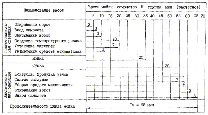 Плотность общей массы твердых отходов при 30 %-ной влажности составляет в среднем 0,4 т/м3, жидких отходов 0,7 - 0,84 т/м3. По дням недели и сезонам накопление производственных отходов происходит неравномерно. Суточный коэффициент неравномерности Ксут, под которым понимают отношение предельной величины суточного накопления к среднегодовому суточному накоплению, рекомендуется принимать для АТБ IV и V групп - 1,15, для АТБ I - III групп - 1,3. Приложение 5ГРАФИКИ ТЕХНОЛОГИЧЕСКОГО ПРОЦЕССА МЕХАНИЗИРОВАННОЙ МОЙКИ САМОЛЕТОВТаблица 1