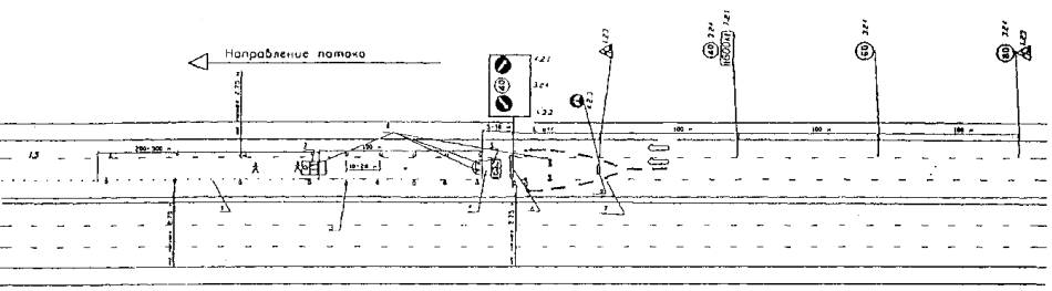 Рис. 10. Нанесение осевых линий при двухполосной проезжей части. 1 - предварительная разметка; 2 - разметочная машина; 3 - сигнальные фишки (конуса) со светоотражающей поверхностью; 4 - машина прикрытия; 5 - импульсная стрелка (d 900; 1200); 6 - временное ограждение с дорожными знаками; 7 - направление объезда транспорта; 8 - сигнальный фонарь (на сигнальных конусах - рекомендуется). Примечания: 1). Дорожные знаки на стойках следует располагать на высоте не менее 2 м; дорожные знаки на временном ограждении следует располагать на высоте не менее 0,6 м. 2). Дорожные знаки 3.24 поэтапно (с шагом 20 км/час) ограничения скорости устанавливают последовательно на расстоянии 100 м друг от друга. 3). Зона действия знака 7.2.1 определяется длиной участка и разметки. 4). Протяженность зоны изменения направления движения Lomz определяется с учетом скорости на подходе (Lomz =50 м при скорости до 40 км/час; Lomz =75 м при скорости до 60 км/час для перекрываемой проезжей части шириной 4 м). 5). Подрядная организация информирует службу ГИБДД о начале работ. 6). Работы проводятся только при наличии технических средств регулирования дорожного движения и схемы разметки, согласованной с ГИБДД. | ||||||||||||||||||||||||||||||||||||||||||||||||||||||||||||||||||||||||||||||||||||||||||||||||||||||||||||||||||||||||||||||||||||||||||||||||||||||||||||||||||||||||||||||||||||||||||||||||||||||||||||||||||||||||||||||||||||||||||||||||||||||||||||||||||||||||||||||||||||||||||||||||||||||||||||||||||||||||||||||||||||||||||||||||||||||||||||||||||||||||||||||||||||||||||||||||||||||||||||||||||||||||||||||||||||||||||||||||||||||||||||||||||||||||||||||||||||||||||||||||||