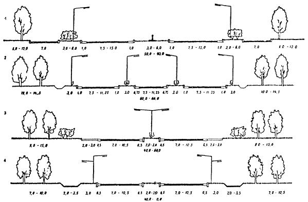 ПРИМЕЧАНИЯ: 1. При промежуточных значениях грузоподъемности транспортных средств коэффициент приведения следует определять интерполяцией. 2. Коэффициенты приведения для автобусов и специальных автомобилей следует принимать как для базовых автомобилей соответствующей грузоподъемности. 3. Коэффициенты приведения грузовых автомобилей и автопоездов при пересеченной и горной местности следует увеличивать в 1,2 раза. Поперечный профиль4.4. Ширину улиц и дорог в красных линиях следует определять путем расчета в зависимости от интенсивности движения транспорта и пешеходов, состава и количества элементов, размещаемых в пределах поперечного профиля, с учетом санитарно-гигиенических условий и требований особых обстоятельств. Как правило, ширина улиц и дорог в красных линиях принимается: магистральных дорог 40 - 75 м; магистральных улиц: в крупных и крупнейших городах 50 - 75 м; в больших, средних и малых городах 30 - 50 м; в поселках и сельских поселениях 20 - 30 м; улиц и дорог местного значения 15 - 25 м. Красные линии обозначают в координатах условную границу между внешними элементами поперечного профиля улиц и дорог (тротуар, обочина, техническая зона и др.) и прилегающей территорией. Многообразие факторов, влияющих на ширину улиц одних и тех же категорий, позволяет рекомендовать только наиболее типичные решения поперечного профиля (см. рис. 1 - 5), которые уточняются для конкретных градостроительных условий. 4.5. При проектировании поперечного профиля состав и количество элементов, их взаиморасположение и пространственное решение определяются особенностями прилегающей застройки, интенсивностью транспортного и пешеходного движения, видами транспорта, использованием надземного и подземного пространства. 4.6. В случаях равноценной застройки и относительно равнозначных по направлениям транспортных потоков поперечный профиль улиц и дорог, как правило, следует проектировать симметричным, а при односторонней жилой или общественной застройке - асимметричным, приближая к застройке линии массового пассажирского транспорта и удаляя автомобильный. На асимметричное решение поперечного профиля улиц и дорог могут повлиять высокая неравномерность автомобильного движения, а также одностороннее расположение основных объектов притяжения населения или автотранспорта. 4.7. На отдельных участках магистральных улиц не рекомендуются размещать более двух видов общественного пассажирского транспорта, при этом основной из них, желательно, устраивать на обособленном полотне по оси проезжей части или с одной из двух сторон улицы. При сравнении вариантов устройства линии общественного пассажирского транспорта на обособленном полотне или в уровне с проезжей частью предпочтение следует отдавать обособленному полотну. Критериями устройства обособленного полотна являются протяженность участка не менее 1000 м (не менее двух перегонов) и интенсивность движения: для трамвая - 20 ед./ч, для автобуса и троллейбуса - 40 ед./ч и более в одном направлении. 4.8. При решении других элементов улиц и дорог рекомендуется: полосы зеленых насаждений помимо разделения различных элементов использовать для устройства защитного озеленения, в целях ограничения распространения пыли, транспортного шума и выхлопных газов автомобилей, размещения шумозащитных стенок, экранов и д