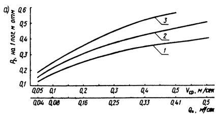 1. При равномерном движении аэрированных цементно-песчаных смесей состава 1:1, 1:2 и 1:3 по горизонтальному раствороводу (резиновые шланги) диаметром 17, 30 и 38 мм Рг определяют из графиков, показанных на рис.1.