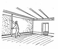 При выравнивании грунта применяется известковый раствор состава 1:3; 1:4 (известь:песок) марки 4. Кроме того, на объекте должна быть вода для смачивания поверхности стены по мере надобности. III. УСЛОВИЯ И ПОДГОТОВКА ПРОЦЕССАПеред тем, как приступить к выравниванию слоя грунта, оштукатуриваемые поверхности должны быть подготовлены в соответствии с требованиями СНиП III-В.13-62 §§ 1.3 - 1.5; 1.7 - 1.9; 1.11 - 1.14; 2.2 и 2.3; К разравниванию слоя грунта надо приступать сразу после механизированного нанесения раствора. Выровненная поверхность штукатурки должна отвечать той точности, которая указана в технических условиях. При разравнивании слоя грунта одновременно наносят раствор в тех местах, где его недостаточно, и срезают в тех местах, где он излишний. Слой грунта разравнивают деревянными полуторками размером 1-0,75 м. При разравнивании поверхность проверяют и выправляют ее правилом. Малым полутерком ведут разравнивание в неудобных местах: ниши, заглушины, шкафы. Для нанесения дополнительного слоя грунта в процессе выравнивания на рабочих местах устанавливаются ящики для раствора, которые наполняются по мере надобности из емкостей, устанавливаемых в коридорах или лестничных клетках, а емкости эти заполняются раствором при помощи растворонасоса. На рабочем же месте находится ведро с водой. При нанесении дополнительного слоя грунта поверхность сначала смачиваетоя водой, а затем наносится намет. Штукатур четвертого разряда выполняет более oтветственные операции по разравниванию слоя грунта правилом и производит выделку лузг и усенков. Штукатуры третьего и второго разряда следом за штукатуром четвертого разряда разравнивают поверхность полутерками, одновременно собирают отскоки раствора, складывают в ящик, перелопачивают его и набрасывают на пропущенные места. До каждого штукатура должны быть доведены технические условия приемки данной работы, согласно СНиП III-В. Все остальные условия и подготовка процесса идентичны с картой КТ. (на процесс подготовки поверхности к оштукатуриванию). Ниже дается примерный график режима труда и отдыха при разравнивании слоя грунта на оштукатуриваемой поверхности кирпичных стен. Для снижения утомляемости в работе должен быть использован отдых, включенный в нормы времени в размере, предусмотренном нормативами, указанными в "Основах методики технического нормирования труда в строительстве" НИИЭС Госстроя СССР, выпуск 1,1967 год. ТЕХНИКА БЕЗОПАСНОСТИПри производстве работ по выравниванию слоя грунта при оштукатурировании кирпичных стен необходимо руководствоваться нормами и правилами по технике безопасности, изложенными в СНиП III-А.II-62 §§ 17.1; 17.5; 17.14; 17.9 и противопожарными мероприятиями. IV. ТЕХНОЛОГИЯ И ОРГАНИЗАЦИЯ ПРОЦЕССАОт качества разравниваемой поверхности грунта зависит качество последнего штукатурного слоя - накрывочного. Поэтому разравнивание должно производиться с особой тщательностью. Одновременно с разравниванием производится выделка лузг, усенков, фасок. Вертикально выполненные лузги, усенки и фаски придают интерьеру нарядный вид. Выделка их является одной из самых трудоемких работ и занимает от 16 до 37 % времени, требуемого на все внутренние штукатурные работы. Перед началом работ на рабочее место подносят необходимый инструмент, инвентарь и приспособления, устанавливают ящики с раствор