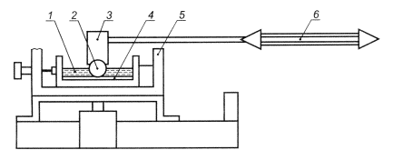 1 - резервуар для топлива; 2 - металлический шарик; 3 - нагрузка; 4 - металлическая пластина; 5 - нагревательный элемент; 6 - направление возвратно-поступательного движения Рисунок 1 - Схема аппарата HFRR Таблица 1 - Условия проведения испытаний