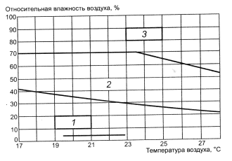 1 - недостаточная влажность; 2 - допустимый диапазон влажности; 3 - избыточная влажность Рисунок 2 - Характеристики воздуха в лаборатории 6.2. Испытательная пластина, изготовленная из каленого металлического прута (сталь по АИСИ Е-52100), с твердостью по Виккерсу «HV 30» от 190 до 210 (ИСО 6507). Её поверхность должна быть от полирована до значения Ra < 0,02 мкм. 6.3. Испытуемый металлический шарик по АНСИ Б 3.12 диаметром 6 мм, изготовленный из стали марки 28 по АИСИ Е-52100, который должен обладать твердостью по Роквеллу от 58 до 66 (ИСО 6508-1) и отполированной поверхностью Ra < 0,05 мкм. 6.4. Микроскоп со 100-кратным увеличением и разрешающей способностью, равной 1 мкм, обеспечивающий измерение пятна износа на испытуемом шарике. 6.5. Эксикатор, содержащий осушающий агент, пригодный для хранения металлических шариков, пластин и деталей аппарата. 6.6. Ванна очистительная ультразвукового типа, мощностью не менее 40 W, с резервуаром из не ржавеющей стали соответствующей емкости. 6.7. Контейнер для топлива из листовой нержавеющей стали с эпоксидным покрытием. Другие материалы могут использоваться для изготовления контейнера только в случае, если они дают аналогичные результаты. 6.8. Устройство для измерения времени, механическое или электронное, позволяющее измерить (75 ±0,1) мин. 6.9. Груз массой 200 г, включающий массу приспособлений для его крепления. 7. Подготовка к испытанию и калибровка7.1. Подготовка аппарата HFRR 7.1.1. Используемые при испытании металлические пластины (зеркальной поверхностью вверх) и металлические шарики с помощью чистых пинцетов помещают в стеклянный контейнер, заливают их толуолом так, чтобы толуол полностью покрыл все пластины и шарики, и оставляют для «замачивания» не менее чем на 8 ч, затем контейнер помещают на 10 мин в ультразвуковую очистительную ванну. После этого пластины (зеркальной поверхностью вверх) и шарики переносят в контейнер со свежим толуолом, контейнер закрывают крышкой и хранят соответствующим образом, избегая загрязнений. 7.1.2. Детали аппарата Перед испытанием все детали аппарата, держатели, шурупы и другие комплектующие детали, контактирующие с испытуемым топливом, помещают вместе с испытуемыми металлическими пластинами и шариками (предварительно очищенными, как описано в 7.1.1) в чистый стеклянный стакан и полностью заливают толуолом. Стакан помещают на 10 мин в ультразвуковую очистительную ванну, затем с помощью чистых пинцетов детали, металлические пластины и шарики перемещают в стакан с ацетоном. Стакан ставят на 2 мин в ультразвуковую очистительную ванну. Затем детали аккуратно вынимают и, если их не используют сразу, хранят в эксикаторе. 7.2. Калибровка и регулировка 7.2.1. Температура Точность терморегулятора, используемого для поддержания необходимой температуры испытуемого топлива, проверяют с помощью калиброванного устройства измерения температуры. 7.2.2. Частота Частоту возвратно-поступательных движений привода проверяют калиброванным частотомером. 7.2.3. Длина хода Длина хода должна быть тщательно измерена, поскольку является основным параметром прецизионности испытания. Длина хода для аппаратов, применяемых в данном методе, контролируется электронной самокалибровкой. Альтернативно длину хода, используя калиброванный микроскоп, проверяют путем измерения полной длины пятна износа на испытательной пластине после проведе