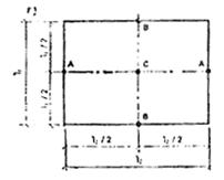 Pис. 52. Размещение монтажных петель в плите, опертой на стены по контуру а — симметричная плита, б — асимметричная плита (с балконом); в — симметричная плита длиной 4,2 м и менее; А, В, С — точки, в которых определяются усилия; е ¾ расстояние между центрами тяжести несущей части всей комплексной панели В случае асимметричных плит с балконами и плитами основания раздельного (плавающего) пола монтажную петлю, расположенную со стороны балкона, рекомендуется смещать по направлению к центру тяжести изделия на величину 6е (рис. 52, в). Таким способом достигается центрирование плиты и частичное использование при монтаже несущей способности балконной консоли. Указанные плиты допускается рассчитывать по формуле (254), принимая в расчет их полную длину. В опираемых по контуру плитах длиной не более 4,2 м допускается устройство четырех монтажных петель, располагаемых в серединах каждой из сторон (рис. 52, г). Указанные плиты следует рассчитывать по формуле (254), принимая коэффициент b по табл. 17. Таблица 17