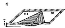 плит, работа внутренних и внешних сил определяется по формулам п. 6 Схема излома плиты П2 показана на рис. 15, г, пунктиром обозначен пластический шарнир с растяжением нижней арматуры. Направление этого шарнира выбрано таким, чтобы работа внутренних сил была минимальной. Из геометрических соотношений находим h1 = 1,55 м; h2 = 1,03 м; а = 20,1°. Угол перелома плиты в пластическом шарнире w = (0,911 — 0,048)/1,03 — (1 — 0,911)/1,55 = 0,781 1/м.