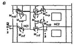 Рис. 4. Варианты механизма прогрессирующего обрушения I типа Если плиты перекрытия заведены в продольные и поперечные стены (платформенные стыки), они образуют между ними практически неразрушимую связь сдвига. В этом случае рассматриваются лишь такие разновидности механизма обрушения I типа, которые возможны при ослаблении поперечной стены дверными проемами (см. рис. 4, б, в). При этом условие (2) принимает вид WIw,in + WIp ³ UIw,in + UIp + Uw,ex, (4) где WIw,in, UIw,in — соответственно работа внутренних и внешних сил на перемещениях отдельных частей панели внутренней стены; WIp, UIp — соответственно работа внутренних и внешних сил, приложенных к плитам перекрытий; Uw,ex — работа внешних сил, приложенных к наружным панелям. Работа WIw,in определяется сопротивлением изгибу над- и подпроемных перемычек и в общем случае определяется соотношением WIw,in = (M¢sup + M¢¢sup + M'inf + M"inf)/b, (5) где M¢sup, M¢¢sup, M'inf , M"inf — соответственно прочности при изгибе левого и правого опорных сечений верхней и нижней перемычек, a b — пролет перемычек. Если поперечная стена отделена от продольной дверным проемом и связь между ними отсутствует, то WIw,in = 0. Если связь между поперечной стеной и продольной осуществляется перемычкой — «флажком» (см. рис. 4, в), то прочность левого опорного сечения (M¢sup) определяется прочностью горизонтальной линейной связи (S2); при этом прочность сдвиговой связи в соответствии с рекомендациями п. 4 должна удовлетворять условию S1 ³ l,5 M¢¢sup/b. (6) Работа Uw,in определяется весом обрушающейся части панели внутренней стены аGw,in, (где Gw,in — вес всей панели, 0 < а < 1) и приложенной к ней вертикальной нагрузкой от навесной лоджии (Gl) UIw,in = аGw,in + Gl. (7) Работа внешних и внутренних сил, приложенных к плитам перекрытий, первоначально опертых по трем сторонам, определяется их пластическим изломом по схеме, показанной на рис. 4, б, в, и вычисляется по формулам WIp = W¢Ip + W¢¢Ip; Up = U¢Ip + U¢¢Ip, (8) где