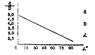 * Для районов со снежным покровом толщиной более 1 м до поверхности земли - не менее 4м ** При мощности свыше 250 кВт - 0,8 м, при мощности ниже 5 кВт - 0,3 м *** Ветви деревьев на любой высоте над фидером недопустимы. Проводить периодический контроль за лесопосадками, находящимися вблизи фидеров. 7.1.17. Минимальное расстояние между осями симметричных фидеров при пересечении их на прямолинейном участке в зависимости от угла пересечения определяется по рис. 1. Допустимое отклонение - (±5 мм) d - расстояние между осями фидеров, мм D - расстояние между разнополярными проводами фидеров, мм a - угол пересечения фидеров, градус Рис. 1 Относительное расстояние между осями симметричных фидеров 7.1.18. Расстояние между промежуточными опорами концентрического фидера для гектометрового и километрового диапазонов принято 15 м. 7.1.19. Расстояние между опорами фидеров передающих антенн декаметровых волн определяется по закону случайных чисел, для приемных антенн - опоры устанавливаются с шагом 11, 13, 15, 13, 11 мм и т.д. 7.1.20. При прохождении КВ фидеров параллельно друг другу расстояние между осями ближайших стоек смежных опор должно быть не менее 4 м. 7.1.21. Установка оконечных фидерных опор у технического здания радиостанции должна обеспечивать возможность пожарного проезда. 7.1.22. Экранные провода СВ и ДВ концентрического фидера на каждой опоре присоединяются к проводам высокочастотного заземления, проложенным вдоль него. 7.1.23. Вводы фидеров в техздании располагается на высоте не менее 3 м от поверхности земли, при меньшей высоте - необходимо ограждение мест вводов, исключающее возможность прикосновения к фидерам. 7.1.24. Расстояние между осями симметричных фидерных вводов в техническое здание или в здание антенных коммутаторов при мощности передатчика до 100 кВт должно быть не менее 5 м; 250 кВт - 2,0 м; 1000 кВт - 3,0 м. 7.1.25. Вводы концентрических фидеров в техздании располагаются на высоте 3,5 м от поверхности земли; расстояние между осями соседних вводов СВ и ДВ фидеров принимается равным 1,5 м. 7.1.26. Для фидеров передающих антенн должны применятся изоляторы из высокочастотной керамики или стеклопластика, для приемных антенн допускается применение изоляторов из других диэлектрических материалов с тангенсом угла потерь не более 0,01. 7.1.27. Для концентрического фидера СВ и ДВ антенн, нагруженного на активную нагрузку равную его волновому сопротивлению, коэффициент бегущей волны не должен быть ниже 0,9. 7.1.28. Коэффициент бегущей волны в главном фидере приемных антенн не должен быть менее 0,2 для УГД, ВГД и т.п., и не менее 0,5 - для РГД, ВС и т.п. 7.1.29. КПД фидера длиной 1 км для передающих антенн должен быть не менее 0,7 (при мощности передатчика до 200 кВт в телефонном режиме), и 0,85 - при мощности более 200 кВт; для приемных антенн - не менее 0,5. 7.1.30. Коэффициент асимметрии в фидерах не должен превышать 5%, угол скоса волны - 3°. 7.1.31. Прохождение КБ, СВ и ДВ фидера под линиями электропередач должно быть выполнено под утлом близким 90°, при этом следует предусмотреть защиту от механических повреждений на расстоянии 1/3 высоты ЛЭП по обе стороны фидера. 7.1.32. При расположении антенн в лесистой местности следует производить вырубку леса по размерам антенн в плане, включая оттяжки мачт, плюс 5 м. Объем вырубки леса в направлении фронта антенн определяется расчетом. 7.1.33. В сейсмических районах страны в гектометровом
