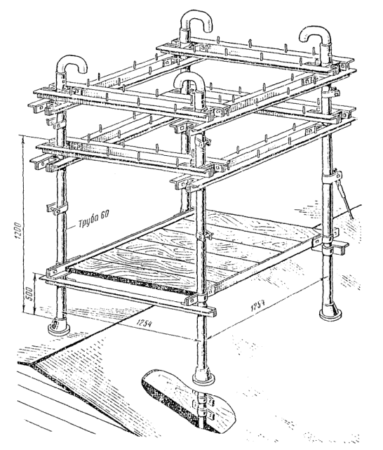 1.2.2. На прямолинейных участках линии при напряжении в цепи до 120 В включительно и одинаковых длинах пролетов допускается установка стоек типа PCI длиной 1300 мм без оттяжек. 1.2.3. Стойки типа PCIII укрепляют двумя ярусами оттяжек. Нижние концы основных (верхних) оттяжек укрепляются при помощи серьги и двух винтовых стяжек (см. рис. 1.5). На линиях типов О и Н оттяжки для стоек типа PCIII изготовляются из одной стальной оцинкованной проволоки диаметром 5 мм, на линиях типов У и ОУ - из двух стальных проволок диаметром 5 мм. Дополнительные оттяжки крепятся к стволу стойки над верхней траверсой; крепление дополнительной оттяжки к стропильному болту производится через винтовые стяжки и серьгу (см. рис. 1.5) или через одну сдвоенную винтовую стяжку. Отверстия в стойке для ввода проводов в здание должны быть плотно закрыты во избежание попадания влаги внутрь стойки. 1.2.4. Стойка типа PCIII должна быть оборудована карманами для ступенек и съемными ступеньками (рис. 1.25 и 1.26). Карманы приваривают по две штуки с двух сторон трубы. Рис. 1.25. Карман для съемной ступеньки. Рис. 1.26. Съемная ступенька. 1.3. Типы и размеры станционных стоек1.3.1. Для вывода проводов из помещения станции применяют выводные станционные стойки. Эти стойки применяют также и в тех случаях, когда при столбовой линии по условиям габарита невозможно установить выводной кронштейн. 1.3.2. Выводные станционные стойки могут быть двусторонние, трехсторонние или четырехсторонние (рис. 1.27 - 1.31). Рис. 1.27. Восьмипарная станционная двусторонняя стойка для вывода цепей напряжением до 240 В включительно (общий вид).