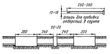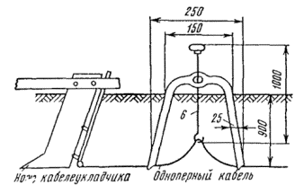 3.9.5. В населенных пунктах нельзя засыпать землей или заваливать мостовыми покрытиями и материалами сточные каналы и решетки, пожарные краны и люки различного рода подземных сооружений. 3.9.6. Дно траншеи должно быть выравнено, очищено от камней и щебня. 3.9.7. Изменение глубины траншеи должно проходить по плавной наклонной линии, без резких уступов. 3.9.8. Длина выкапываемой траншеи должна быть равна длине кабеля, прокладываемого за один рабочий день. Если по условиям работы траншея оставляется открытой на ночь, то она должна быть ограждена и около нее установлен световой сигнал. Кроме того, там, где нужно, через траншею устанавливают временные пешеходные мостики с перилами. 3.9.9. Однопарные кабели прокладывают в траншею с переносного тамбура. Если вдоль трассы можно проехать на автомашине, то кабель перематывают на барабан и устанавливают на козлах, так, чтобы он свободно вращался при размотке. 3.9.10. Одночетверочные и многопарные кабели прокладывают с барабана, установленного на автомашине или на кабельной тележке. 3.9.11. Во всех случаях барабан с кабелем при размотке должен равномерно вращаться. Разматывать кабель, вытягивая колец его с неподвижного барабана, не разрешается. 3.9.12. Кабель должен укладываться посередине дна траншеи. Если в одну траншею укладывается несколько кабелей (PC или СТС), то они должны лежать параллельно и не перекрещиваться. Одночетверочные высокочастотные кабели должны находиться на дне траншеи на максимальном расстоянии друг от друга. 3.9.13. После того как кабель уложен, траншею засыпают слоями земли по 15 - 20 см, причем каждый слой плотно утрамбовывают. В первом слое грунта не должно быть камней и других предметов, которые при утрамбовке могут повредить кабель. В населенных пунктах траншею покрывают верхним покрытием, а в поле - дерном. 3.9.14. При прокладке кабеля нельзя нарушать водоспуски и дренажные устройства. В тех случаях, когда избежать прокладки кабеля в зоне полотна шоссейных или железных дорог невозможно, все водоспуски и дренажные устройства, если они попали в трассу, должны быть восстановлены. 3.9.15. Поверхность засыпанной траншей следует восстанавливать только после осадки грунта. 3.9.16. Для облегчения и ускорения прокладки кабеля ручным способом на коротких участках подземных линий траншею роют с промежутками в 5 м. Затем в нее с помощью домкрата проталкивают стальной штырь длиной 2,5 - 2,6 м диаметром 12 - 15 мм. Чтобы пробить весь промежуток (5 м), посередине его отрывают дополнительную яму шириной 20 - 30 см, как показано на рис. 3.5. Оставшуюся часть промежутка пробивают с другой стороны. Кабель протягивают через отверстие при помощи проволоки диаметром 3 - 4 мм, загнутой в виде небольшого кольца на конце. Рис. 3.5. Способ прокладки кабеля ручным способом на коротких участках подземной линии (размеры даны в см). 3.10. Устройство переходов через водоемы и овраги3.10.1. При пересечении больших рек кабель прокладывают, как правило, в трубах, подвешенных или уложенных под фермами моста. Резервные переходы не устраиваются. В тех случаях, когда по мосту проложить кабель невозможно, кабель прокладывают по дну реки. 3.10.2. Переход через судоходную реку кабеля линий СТС или PC необходимо устраивать на глубоком месте и на расстоянии не ближе 300 м от пристаней, переправ или мест стоянки судов. Дно реки в месте перехода должно быть без 
