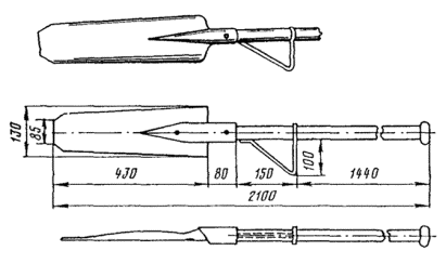 3.9. Прокладка кабелей СТС и PC ручным способом3.9.1. Перед рытьем траншеи намечают в грунте ее боковые линии. Места пересечения трассы табеля с другими подземными сооружениями обозначают колышками с надписями «Кабель», «Водопровод», «Дренаж» и т.п. 3.9.2. При рытье траншеи ручным способом землю выбрасывают на одну сторону (в сторону поля). Если имеются дерн или мостовые покрытия (булыжник, асфальт, щебень и т.п.), то их следует складывать в штабеля на другой стороне так, чтобы после засыпки траншеи использовать для покрытия разрытого места. 3.9.3. До глубины 30 см траншею роют обычной лопатой, а далее траншею углубляют специальной лопатой (рис. 3.4), для штыковой части которой рекомендуется применять сталь толщиной 2 мм. Рис. 3.4. Специальная лопата для рытья траншей. 3.9.4. Глубина траншеи должна быть не менее 1,2 м. Минимальная ширина траншеи для прокладки кабелей приведена в табл. 3.3. Таблица 3.3 Минимальная ширина траншеи для прокладки кабелей