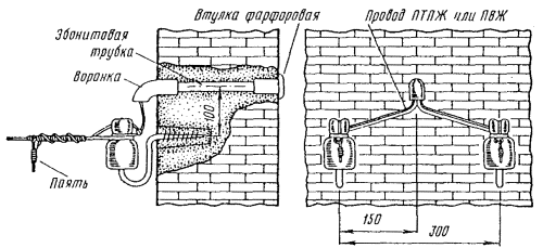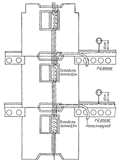 Примечания: 1. Все провода с медными жилами можно применять для телефонной проводки и для стояков PC в домах с повышенной этажностью. 2. При устройстве ввода через стойку надо выполнять следующие правила монтажа проводов: - при протягивании провода ПТВЖ через трубу стойки обе жилы его соединяют параллельно и используют как один провод; - при устройстве абонентского ввода PC или СТС оба провода ввода помещают в одной полутвердой резиновой трубке; - если абонентский ввод РС устраивают в здании, где нет чердачного помещения или это помещение есть, но оно непригодно для нормальной эксплуатации разветвительных коробок, а также в здании, где оборудуется только одна радиоточка и увеличения числа радиоточек не предвидится, то каждую жилу провода ПТВЖ или ПТЖ вводят в трубу стойки в отдельной полутвердой резиновой трубке. 3. В домах с большой нагрузкой радиотрансляционных точек, когда провода со стальными жилами по электрическим параметрам непригодны, разрешается применять провода с медными жилами. 4. При оборудовании групповой распределительной сети многопрограммного вещания в зданиях прокладывается трехпарный кабель типа КРВПС (при отсутствии его допускается прокладка трех пар проводов) и устанавливается обычная распределительная арматура для включения обычных громкоговорителей. 5.4. Устройство чердачной проводки5.4.1. При вводе через трубу стойки в здания, имеющие более одной лестничной клетки, разводка проводов к лестничным клеткам проводится по чердаку (рис. 5.24). Разводка по чердаку должна проводиться и в тех случаях, когда ввод в здание осуществляется со столбовой линии в ближайшую от места ввода лестничную клетку. При совместной прокладке проводов и кабеля радиотрансляционной и телефонной сетей по чердаку необходимо соблюдать те расстояния между ними, которые приведены в п. 5.5.5. В зданиях, выполненных из железобетона, прокладка чердачных проводов осуществляется в стальных трубах или в металлорукаве. Крепление труб или металлорукава к строительным железобетонным перекрытиям осуществляется при помощи металлических накладок. Рис. 5.24. Разводка проводов к лестничным клеткам. 5.4.2. Провода с хлопчатобумажной изоляцией прокладывают по чердачному помещению на роликах, а провода с поливинилхлоридной или полиэтиленовой изоляцией - под скобки или прибивают стальными (каблучными) гвоздями. Расстояние между роликами и скобками указано в разд. 5.8. 5.4.3. Провода прокладываются по стропильным балкам чердака, переходы с одной балки на другую проводятся по специально прибиваемым доскам толщиною 20 мм и шириной 90 мм. Если между стропилами расстояние 120 см и менее, то доски прибивать не следует. 5.4.4. В чердачных помещениях зданий индивидуального пользования провода крепятся только к стропилам. Между стропилами провода свободно провисают. 5.4.5. Ролики Р-25 и Р-32 в чердачном помещении устанавливают на стропильных балках или досках сбоку или снизу для каждого провода в отдельности так, чтобы провод в случае его провисания не ложился на доску или стропильную балку. Расстояние между проводами должно быть 35 мм. Ролики крепят шурупами. В исключительных случаях промежуточные ролики должны укреплять гвоздями. 5.4.6. Спуск проводов к проходам, отверстиям, в чердачном перекрытии делается по доскам (размер 20×90), прибиваемым одним концом к стропилам, а дру