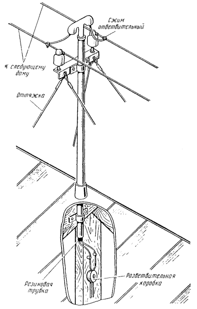 Примечание. Длина шурупов указана для крепления роликов на неоштукатуренных деревянных стенах. На каменных стенах длина шурупов должна быть увеличена на 15 мм, а на оштукатуренных деревянных - на 25 мм. 5.2.26. Заделка проводов ПРЖ, ПТВЖ, ПВЖ, ПТПЖ на вводных изоляторах производится, как указано на рис. 5.5 - 5.7. Для удобства заделки конец вводного провода поворачивают вокруг шейки изолятора на полтора оборота (см. 3 на рис. 5.3). 5.2.27. При групповом вводе провода с изоляторов проходят через стену в помещение лестничной площадки и прокладываются скрытым или открытым способом до разветвительной коробки, устанавливаемой на лестничной площадке (см. разд. 5.6). 5.2.28. Фидерный ввод со столбовой линии II класса оборудуется так же, как и абонентский групповой ввод, с тем отличием, что в данном случае провода прокладываются не до разветвительной коробки, а до места установки абонентского трансформатора. В домах, построенных по индивидуальным типовым проектам, проводка выполняется только скрытым способом, за исключением зданий, сооружаемых из лесоматериалов. 5.2.29. Вводные изоляторы на здании устанавливают вблизи лестничной клетки. При наличии нескольких лестничных клеток рекомендуется оборудовать фидерный ввод в ближайшую от вводного столба лестничную клетку. 5.2.30. В многоэтажных домах питание радиоточек осуществляется от проводов, подключаемых к выходу абонентского трансформатора, установленного на первом или втором этаже. 5.2.31. Питание радиоточек, установленных в квартирах, расположенных на нескольких лестничных клетках, при наличии одного фидерного ввода в радиофицируемое здание осуществляется путем прокладки по лестничным клеткам проводов, подключения их к абонентскому трансформатору или разветвительной коробке через соединительные линии, проложенные по чердачному помещению (рис. 5.12). Рис. 5.12. Схема построения радиотрансляционной сети в доме. 5.2.32. Абонентский ввод в дом со стоечной линии осуществляется через абонентский трансформатор, укрепленный на стойке, устанавливаемой на крыше здания (рис. 5.13). Стойки должны устанавливаться ближе к коньку крыши так, чтобы провода и части стоек не затрудняли доступа к дымовым трубам, слуховым окнам и другим устройствам, а также, чтобы провода не проходили над дымовыми трубами. Рис. 5.13. Устройство абонентского ввода со стоечной линии. 5.2.33. Провода ввода соединяются с голыми проводами воздушной линии при помощи сжимов или, как исключение, при помощи перевязочной проволоки («британской» спайки). Для удобства заделки конец вводного провода на стойке поворачивается вокруг шейки изолятора на один-полтора оборота. Место соединения вводного провода с линейным следует покрасить масляной краской либо асфальтовым лаком, обмотав предварительно место соединения изоляционной лентой. 5.2.34. Провода ПРЖ, вышедшие из стойки в чердачное помещение, закрепляют каждый в отдельности свободно без натяжения на первой паре роликов типа Р-25 или Р-32. Если применяются провода ПТВЖ, ПТПЖ, ПВЖ, то обе жилы вышедшего из стойки провода крепятся под скобку. Ролики или скобки устанавливаются на стропильной балке на расстоянии не более 20 см от стойки. После того как провода укреплены на первой паре роликов или под скобкой, их включают в разветвительную коробку, которая устанавливается также на стропильной балке, а затем прокладыв