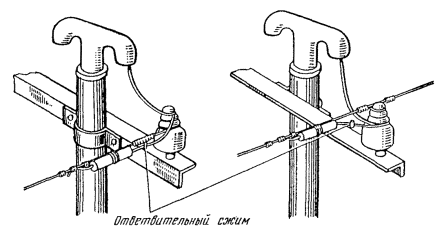 1.10.8. Провода PC на стойках можно подвешивать над проводами линий электропередачи (ВЛ) с напряжением не более 380/220 В. В пролете пересечения применяются провода марки ПРСП или ПРСВ диаметром 3 или 4 мм. На стойках, ограничивающих пролет пересечения, линейные провода должны иметь двойное крепление. 1.10.9. Переходные стойки должны иметь диаметр трубы не менее 60 мм. 1.10.10. Соединение и крепление проводов PC на переходных стойках при пересечении контактных сетей должны производиться по указаниям рис. 1.55. При пересечении линий электропередачи и линии PC крепление проводов производится так, как показано на рис. 1.53. Рис. 1.55. Соединение каната с линейным проводом на стойках при пересечении контактных сетей: а) крепление проводов на трех изоляторах; б) крепление проводов на двух изоляторах. 1.10.11. Нижние провода линий PC, пересекающие контактные сети (с учетом наихудших метеорологических условий для данной местности при гололеде, изморози или максимальной температуре) должны располагаться в пролете пересечения на высоте: - не менее 2 м над верхними проводами контактной сети эл. ж. д. постоянного тока; - не менее 8 м от головки рельс (трамвая) и не менее 9 м от уровня полотна дорожного покрытия (троллейбуса). 1.10.12. Устройство и ремонт проводов линий PC при воздушном пересечении с контактными сетями наземного электротранспорта должны производиться в соответствии с действующими правилами техники безопасности при производстве работ на контактных сетях эл. ж. д. постоянного тока, трамваев и троллейбусов. Указанные работы проводятся при отключенной и заземленной на месте производства работ контактной сети и при обязательном присутствии представителя службы дистанции (района) контактной сети. В исключительных случаях, по согласованию между заинтересованными организациями, допускается производить работы на линиях PC, пересекающих контактную сеть трамваев или троллейбусов, без снятия напряжения в контактной сети. Устройство и ремонт подземного кабельного пересечения линиями PC контактных сетей наземного электротранспорта можно производить без отключения напряжения в контактной сети. 1.10.13. В пролете подземного пересечения линий PC с проводами контактных сетей наземного электротранспорта могут быть применены следующие кабели: - для PC II класса - типов ПРППМ, МРМП, МРМ; - для PC I класса - типов МРМП, МРМ, МРМПЭ, МРМПЭБ, СРВ и КСНБ. При прокладке в канализации или в трубах городских линий при всех напряжениях линии PC применяют кабели типов МРМ, МРМП, МРМПЭ и МРМПЭБ. При многопрограммном вещании и напряжении до 360 В рекомендуется применять кабели типов МРМ, МРМП, МРМПЭ, МРМПЭБ. 1.11. Фидерные отводы и выводы из помещений станций или подстанций радиотрансляционных узлов1.11.1. Если радиофицируемый пункт находится в стороне от фидерной линии, то прокладывается к нему специальная линия, которую называют фидерным отводом. Устройство фидерного отвода на стоечных линиях изображено на рис. 1.56. Рис. 1.56. Устройство ответвления проводов от фидера. 1.11.2. Понижающие трансформаторы могут устанавливаться на стойках, в чердачном помещении, на лестничной клетке и в помещении радиофицируемого дома. 1.11.3. В качестве выводных проводов для линий II класса применяют провода марок ПРЖ, ППЖ, ПТПЖ, ПВЖ, ПРППМ или ПРВПМ с сечением жилы не менее 1,0 мм2, прокладываемые в шлангах. В трубу стойки пров