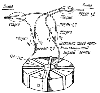 Перед монтажными работами поливинилхлоридные и полиэтиленовые ленты нарезают и скручивают в рулоны. Чтобы рулоны не раскручивались, их закрепляют простой изоляционной лентой. Примечание. Более подробно о сращивании кабелей изложено в следующих инструкциях, руководствах и справочниках: - Инструкции по проектированию, строительству, монтажу и эксплуатации подземных магистральных фидерных линий сельской радиофикации из кабелей МРМ и МРМП (М., «Связь», 1970); - Временном руководстве по прокладке и монтажу однопарных кабелей с пластикатовой, изоляцией для радиофикации и сельской телефонной связи (М., Связьиздат, 1963); - Временной инструкции по прокладке и монтажу одночетверочных кабелей типа КСПП (М., «Связь», 1970); - Инженерно-техническом справочнике по электросвязи (Сельская телефонная связь) (М., «Связь», 1973). При восстановлении изоляции смесь пластификаторов наносится на ленты или оболочки мягкой кисточкой, а полиизобутиленовая масса - деревянной палочкой. Кисточку и деревянную палочку во избежание их загрязнения рекомендуется хранить в пробирках. В полевых условиях изоляцию кабеля восстанавливают клеящими составами в монтажном станке. Подлежащий сращиванию участок кабеля с соединенными токопроводящими жилами укрепляют в станке двумя зажимами. Жилы разводят в сторону, а 30 - 40 мм изоляции и оболочки зачищают монтерским ножом по обе стороны от оголенного участка токопроводящих жил. Поливинилхлоридную оболочку кабелей «восьмерочной» конструкции типов ПРВПМ и ПТВЖ при соединении их между собой и с кабелями типов ПРППМ, ПРПВМ, ПТПЖ восстанавливают поливинилхлоридной лентой со смесью пластификаторов путем индивидуальной обмотки каждой жилы. На зачищенную поверхность пластиката наносится тонкий слой смеси пластификаторов, причем края оболочки на 3 - 4 мм от оголенного участка жил должны оставаться сухими. Конец ленты накладывают на сухой край оболочки, вокруг нее делают один оборот и далее лента навивается с 50 % перекрытием вдоль оголенной жилы. На другой сухой конец оболочки ленту наматывают в обратном направлении. После двух первых слоев ленты, наматываемых без смеси пластификаторов, на оболочку и ленту наносят кисточкой смесь пластификаторов. Далее ленту наматывают таким образом, чтобы каждый последующий слой по длине был больше предыдущего на половину ширины ленты. Поливинилхлоридная лента должна навиваться без сильного натяжения, без образования неровностей и «карманов». Особенно тщательно следует наматывать ленту по краям при наложении на оболочку кабеля. После намотки всей ленты на одну жилу сросток обматывается изоляционной лентой, клеящим слоем вверх, или миткалевой лентой и перевязывается шпагатом или суровыми нитками. По краям сростка шпагат наматывают плотно виток к витку на длине 15 -2 0 мм. Аналогичным образом восстанавливают и закрепляют оболочку второй жилы кабеля, после чего сросток считается подготовленным к прогреву. Полиэтиленовая изоляция жил кабелей ПРПВМ, ПРППМ, ПТПЖ «восьмерочной» конструкции и типа МРМ при соединении с такими же кабелями восстанавливается полиэтиленовой лентой с полиизобутиленовой массой путем индивидуальной обмотки каждой жилы. Полиэтиленовая лента навивается только на полиэтиленовую изоляцию и оголенный участок токопроводящей жилы, не захватывая поливинилхлоридную
