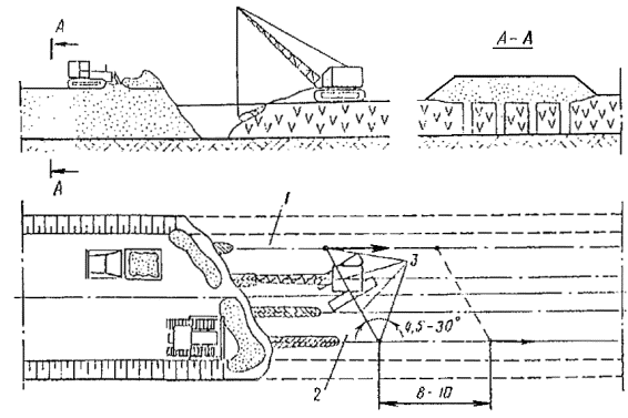 9.12. При наличии вблизи карьера источника водоснабжения поверхность грунта, подлежащая разработке, может быть отеплена намораживанием пенольда толщиной до 40- 50 см, который в дальнейшем очищается по мере разработки карьера бульдозерами. Образование пенольда происходит путем нанесения пожарными машинами на поверхность грунта слоев водовоздушной пены толщиной 10-15 см с последующим их замерзанием при температуре воздуха ниже 10-15°С. 9.13. Резервы, предназначенные к разработке в зимних условиях, должны быть обследованы предварительно осенью. В задачу обследования входит определение плотности и влажности грунтов для решения вопроса о пригодности того или иного резерва или его участка для разработки. Пробы грунта для этих целей берут до глубины, намеченной к разработке. После наступления морозов проверяют влажность грунта в верхнем слое. 9.14. При возведении зимой на поймах рек больших из обводненного песка рекомендуется организовать его добычу и хранение в отвалах до наступления морозов. В процессе хранения при отрицательных температурах влага из песка частично вымерзает и после оттаивания его можно разрабатывать и укладывать в насыпь. Разработка выемок и возведение насыпей9.15. При разработке выемок или карьеров в зимних условиях необходимо очищать поверхность экскавации от снега, льда, кустарника, растительного слоя, отепляющих материалов не более чем на одну смену вперед и в дальнейшем по мере продвижения забоя непосредственно перед началом разработки грунта. Площадь очистки определяется суточной производительностью землеройной машины при температуре до -10° С, а при более низких температурах - ее сменной производительностью. При сильных снегопадах и метелях разработку грунта и отсыпку насыпей следует прекращать, а перед возобновлением работ полностью удалять с насыпи снег и лед. Во время оттепелей и перед началом весеннего снеготаяния верхняя часть и откосы насыпей, возведенные зимой, должны быть очищены от снега. Дно и откосы выемок следует планировать после оттаивания грунта. 9.18. При промерзании грунта в карьерах или выемках на глубину, превышающую указанную в пп. 9.16 и 9.17, его разработка возможна только после подготовки поверхности одним из следующих способов: предохранением грунта от промерзания, рыхлением мерзлого грунта, оттаиванием мерзлого грунта. 9.19. Предохранение грунта от промерзания позволяет вообще исключить замерзание поверхности карьера или снизить толщину мерзлой корки до тех пределов, когда для ее разрушения можно применять навесные тракторные рыхлители. Тип базового трактора-рыхлителя должен выбираться в зависимости от глубины промерзания: Глубина промерзания, м..................................... 0,3-0,4 0,5-0,7 0,7-0,8 Необходимое тяговое усилие трактора, ТС...... 10-12 15-20 20-30 При таких глубинах рыхление ведется путем взламывания мерзлого слоя грунта снизу за один прием (рис. 9.3). Послойное рыхление мерзлого грунта может проводиться только тяжелыми рыхлителями, смонтированными на тракторах, развивающих тяговое усилие свыше 20 тс. 9.20. Для рыхления мерзлого грунта (при глубине промерзания от 0,6 до 1,0 м) можно применять также различное навесное оборудование ударного действия, смонтированное на бульдозерах, тракторах, тракторных погрузчиках и экскаваторах, рабочими органами которых служат клиновые рыхлители, погружаемые д