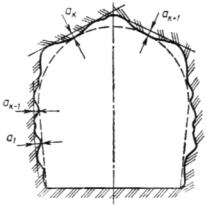 Рис. 2. Определение параметров неровностей контура выработки при расчете набрызгбетонной крепи: — — — проектное очертание выработки 3.29. Отклонение реального контура поверхности выработки от гладкого может явиться причиной появления в вершинах неровностей нежелательных растягивающих напряжений. В этом случае необходимо обеспечить корректировку толщины набрызгбетонного покрытия hн из условия недопущения растягивающих напряжений в вершинах неровностей. Характеристиками неровностей являются их среднее число на контуре Кк и их средняя амплитуда