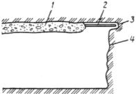 Рис. 3. Пример крепления тоннельных выработок в плотных глинах типа протерозойских: 1 - набрызгбетон; 2 - металлические стержни; 3 - «штраба»; 4 - лоб забоя 3.38. В зависимости от конкретных инженерно-геологических условий и принятой схемы организации работ операции по возведению крепи могут выполняться циклично отдельными заходками в соответствии с продвижением забоя или по поточной схеме после окончания проходческих работ на достаточно большой длине тоннеля. 3.39. Непосредственно перед нанесением набрызгбетона на поверхность выработки необходимо очистить ее от отслаивающихся кусков породы, продуть сжатым воздухом и промыть водой при давлении в шланге 0,2 - 0,3 МПа (промывка исключается, когда набрызгбетон наносят на слабые породы, склонные к размоканию, или на породы с отрицательной температурой). 3.40. При наличии фильтрации и сосредоточенных течей на поверхности породы вода должна быть отведена до нанесения набрызгбетона. Для этого в местах концентрированных течей следует пробуривать шпуры на глубину 10 - 20 см и устанавливать в них водоотводные трубки. Для выбора способа нанесения набрызгбетона на обводненные поверхности рекомендуется пользоваться данными приложения 12. 3.41. При возведении набрызгбетонных покрытий на обводненных поверхностях рекомендуется применять добавки для ускорения схватывания и твердения (см. приложение 6). 3.42. При нанесении набрызгбетона на поверхность породы с отрицательной температурой необходимо очистить ее от льда, продуть сжатым воздухом и при необходимости пескоструйным аппаратом. Промывать породу водой не следует во избежание образования ледяной корки. 3.43. Набрызгбетонирование армированных покрытий должно производиться при соблюдении следующих требований: арматурная сетка должна иметь ячейки размерами не менее 100 х 100 м при диаметре проволоки 2 - 4 мм и отстоять от поверхности породы не менее чем на 2 см. 3.44. Сетку прижимают к поверхности выработки, с помощью стержневых подхватов, заводимых за опорные плитки анкеров или привариваемых к выступающим концам анкеров. При необходимости дополнительного крепления армосетки, например, в случае больших неровностей контура, следует устанавливать специальные монтажные анкеры длиной 0,4 - 0,6 м или заделывать проволочные скрутки в первый (защитный) слой набрызгбетона. При резких колебаниях рельефа контура выработки, например при местных вывалах, для обеспечения требуемых зазоров сетку рекомендуется разрезать и концы ее подогнуть внутрь впадины с последующим дополнительным армированием в местах таких разрезов 3.45. В грунтах, склонных к размоканию или интенсивному разуплотнению из-за выветривания, трещинообразования и т.п., анкеры и сетку следует устанавливать после нанесения первого слоя, при этом надо применять анкеры на омоноличивающих составах, не содержащих воду, например на полимерной основе, а шпуры бурить без промывки. При использовании набрызгбетона в комбинации с арочной крепью арки рекомендуется монтировать после нанесения первого (выравнивающего) слоя набрызгбетона. При использовании решетчатых (арматурных) арок набрызгбетонирование выполняется после установки арки и монтажа арматурной сетки. 3.46. Сухую смесь для набрызгбетона следует, как правило, приготовлять централизованно на механизированных бетонных узлах при соблюдении точн