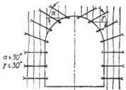где Vн - минимальное радиальное смещение контура выработки, м (рекомендуется пользоваться программой типа FOK-4 и FAK-1, приложение 10); Rв - расчетное сопротивление набрызгбетонного покрытия на сжатие по первой группе предельных состояний, МПа (см. приложение 9); R -радиус свода выработки, м; Ен - модуль упругости набрызгбетона (начальный) на сжатие, МПа (см. приложение 9). Если указанное условие выполняется, то полагают, что прочность набрызгбетонного покрытия будет обеспечена. В противном случае рекомендуется применение анкер-набрызгбетонной крепи. Если прочность грунта недостаточна для обеспечения устойчивости выработки, то при ровном контуре толщину набрызгбетона следует назначать, исходя из расчета набрызг-бетонного покрытия как монолитной обделки. При этом, учитывая, что технология возведения набрызгбетонной обделки по сравнению с опалубочным бетонированием позволяет существенно снизить разуплотнение массива, особенно в сводовой части выработки, и тем самым способствует большей стабилизации напряженно-деформированного состояния массива, допускается принимать расчетную нагрузку на крепь в этом случае на 30 % меньше по сравнению с нагрузкой на монолитную обделку для этих же условий. Учет влияния неровностей фактического контура выработки на несущую способность такой крепи следует проводить в соответствии с п. 3.29.
