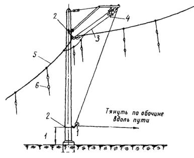 Примечание. При расстояниях между опорами, отличающихся от приведенных в таблице, длину поперечного несущего троса определяют путем интерполяции. Длина фиксирующих тросов определяется непосредственным промером расстояния между опорами. 4.4.4. Монтаж и армирование гибких поперечин производят в следующем порядке: подвешивают верхний фиксирующий трос; подвешивают поперечно-несущие тросы; армируют тросы деталями (завеска точек); подвешивают нижний фиксирующий трос (после раскатки продольных несущих тросов, а для гибких поперечин, перекрывающих более десяти путей, - после раскатки несущих тросов и контактных проводов); регулируют гибкую поперечину (после подвески контактного провода). 4.4.5. Верхний фиксирующий трос подвешивают в следующем порядке: армируют анкеровочные штанги изоляторами; на одном конце верхнего фиксирующего троса заделывают клиновой зажим и крепят к тросу анкеровочную штангу с изоляторами; подвешивают один конец троса на опору через анкеровочную штангу; с помощью крюкового зажима поднимают второй конец троса на опору и уточняют необходимую длину троса; после этого конец троса опускают вниз, обрезают и заделывают в клиновой зажим; с помощью полиспаста конец троса поднимают на опору, вытягивают и крепят с изоляторами к опоре через предварительно подвешенную анкеровочную штангу. 4.4.6. Порядок подвески поперечно-несущих тросов рекомендуется следующий: производят армировку опор анкеровочными штангами с изоляторами; на конце поперечно-несущего троса заделывают клиновой зажим или коуш; подвешивают один конец всех поперечно-несущих тросов на опору через анкеровочную штангу с помощью полиспаста; трос перетаскивают через пути, к его концу прикрепляют крюковой зажим, с помощью полиспаста конец троса поднимают на опору и задают стрелу провеса необходимой величины. Наибольшая стрела провеса поперечно-несущего троса должна быть не менее 1/10 длины поперечного пролета. На поднятом тросе меткой отмечают необходимую длину и опускают его вниз; рубят трос по метке, заделывают его конец на клиновой зажим и соединяют с изоляторами заранее армированной анкеровочной штанги; с помощью полиспаста производят подъем и подвеску на опору второго конца поперечно-несущего троса. В том же порядке производится подвеска остальных поперечно-несущих тросов гибкой поперечины. При интенсивном движении поездов и занятости путей переброска поперечно-несущих тросов производится по верхнему фиксирующему тросу с применением люльки и поддерживающих крючьев. Примечания. 1. Концы троса, выступающие из клиновых зажимов, должны быть прикреплены к тросу проволочными бандажами. 2. Нижние точки всех поперечно-несущих тросов одной гибкой поперечины должны находиться на одном уровне. 3. Тросы гибкой поперечины не должны иметь выкрутов и изломов. 4.4.7. Армирование гибких поперечин производится в следующем порядке: на земле собирают гирлянды изоляторов и к ним крепят седла; при этом плашечные зажимы вывертывают и крепят проволокой к седлу; на поперечных несущих тросах для каждого электрифицируемого пути устанавливают зажим. При четырех несущих тросах два зажима, находящиеся в створе, следует соединять планкой; одновременно на верхнем фиксирующем тросе устанавливают хомутовые зажимы для крепления изоляторов. Бригадир или старший звена, нах