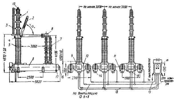 Кроме того, у бригады должны быть клещи типа ПК-1, с помощью которых можно оконцовывать и соединять опрессованием медные и алюминиевые жилы проводов сечением 16 ¸ 50 мм2 и перекусывать шины сечением до 70 мм2. Вес пресса РГП-7М в рабочем состоянии - 6,5 кг; вес клещей типа ПК-1 - 2,5 кг. Ошиновку с помощью машины МШТС-2 выполняют 3 чел. г) Открытые распределительные устройства5.2.17. При монтаже открытых распределительных устройств производится ревизия, сборка, установка и регулировка разъединителей, отделителей и короткозамыкателей. Работы выполняются следующим образом: устанавливают с помощью автокрана оборудование на строительные конструкции; выверяют правильность установки оборудования, проверяя положение осей симметрии и по уровню; закрепляют опорную раму; устанавливают приводы и промежуточные подшипники; производят предварительное сочленение разъединителя с приводом и блок-контактами; регулируют контакты и проверяют их нажатие; проверяют одновременность включения контактов; производят общую регулировку разъединителя, привода и блок-контактов; окончательно соединяют разъединитель с приводом. 5.2.18. При ревизии разъединителей, отделителей и короткозамыкателей выполняются: наружный осмотр, очищается пыль и грязь; проверка состояния поверхности фарфоровых деталей, на которых не должно быть трещин и сколов; проверка состояния контактных поверхностей (отсутствие раковин и пленки окиси); проверка отсутствия боковых ударов ножа о губки и ударов ножа о головку изолятора; проверка исправности пружин и ножей и наличие требуемого нажатия контакта; проверка состояния гибких связей и всех креплений. Ножи должны входить в губки плавно, без ударов; зазор при полностью включенном ноже между его нижней гранью и головкой изолятора должен быть 3 - 5 мм. При полном отключении ножа угол его поворота должен соответствовать паспортным данным этого изделия. Плотность прилегания контактов определяется щупом толщиной 0,05 мм и шириной 10 мм. Щуп не должен входить между неподвижным контактом и ножом на глубину более 4 - 5 мм. Контактное давление проверяют путем замера динамометром усилия при вытягивании ножа из губок. Величина усилия должна соответствовать следующим данным: Усилие Номинальный ток разъединителя, а вытягивания, кг 400.......................................................................................................... 10 - 12 600.......................................................................................................... 16 - 18 1000........................................................................................................ 18 - 20 2000 - 3000............................................................................................ 50 - 60 4000........................................................................................................ 70 - 80 Силу нажатия регулируют нажимными винтами или пружинами, предусмотренными для этой цели в данной конструкции. 5.2.19. Одновременность включения ножей регулируют изменением длин междуполюсных тяг. Величина зазора между запаздывающим ножом и губкой в момент касания губок опережающим ножом не должна превышать 3 мм для разъединителей напряжением до 35 кв и 5 - 7 мм - до 220 кв. Величина холостого хода (люфта) рукоятки привода при оперативных переключениях для всей передачи не должна быть более 5° (см. ВСН 12-59, п. 391). При необходимости производится регулировка путем изменения длины тяг. 5.2.20. По окончании монтажа все трущиеся части контактной системы и привода должны быть промыты бензином и смазаны соответствующей смазкой: 