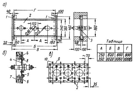 * В состав бригады не входит. А. Сооружение конструкций открытой части тяговой подстанции 3.4.2. На открытой части тяговой подстанции сооружаются: опоры под оборудование, состоящие из рамно-ригельных конструкций и свай-стоек с прикрепленными к ним ригелями или без ригелей; порталы (и отдельно стоящие опоры) - из типовых железобетонных консольных опор контактной сети, устанавливаемых на фундаменты типа «ДС»; наземные кабельные каналы из отдельных железобетонных коробов; фундаменты под понизительные трансформаторы и т.д. 3.4.3. Опоры под оборудование, состоящие из свай-стоек, рекомендуется сооружать методом вибропогружения с применением буровой машины БКГМ, крана КТС-5Э, вибропогружателя ВП-2, металлического кондуктора, наголовника, трубы для образования скважин и амортизатора. Энергию для питания вибропогружателя, а также других машин, используемых при строительстве (при отсутствии возможностей получения энергии от существующих сетей), получают от электростанции мощностью 50 - 60 квт. Работы по вибропогружению, а именно - установка металлического кондуктора, погружение трубы и свай-стоек в грунт, перестановка кондуктора на новое место, выполняются бригадой из 4 чел.: машиниста крана КТС-5Э и трех монтажников (такелажников). 3.4.4. Погружение свай-стоек необходимо выполнять в следующем порядке. На площадку предварительно завозят до 50 % свай-стоек, которые разгружают в заранее намеченных местах (с учетом зоны действия и беспрепятственного прохода крана). Стойки следует раскладывать так, чтобы оси имеющихся в них отверстий располагались параллельно поверхности строительной площадки. Соблюдение этого условия позволит в последующем надевать наголовник на сваи-стойки без их раскантовки. Места погружения свай-стоек определяют с помощью теодолита и закрепляют колышками. С помощью буровой машины или полой трубы образовывают скважины, необходимые для повышения точности и сокращения времени погружения свай, предохранения их от трещин и сколов, определения, нет ли в грунте валунов и других включений, а также повышения производительности вибропогружателя. Рис. 31. Кондуктор для погружения свай-стоек открытой части тяговой подстанции Буровой машиной БКГМ бурят скважины диаметром 20 см и глубиной 2 м, а для свай, погружаемых на глубину более 2 м, скважины образовывают путем вибропогружения в грунт полой трубы длиной 5 м. В стенках трубы вырезают окна шириной 0,2 длины окружности, длиной до 1,5 м, для того, чтобы облегчить извлечение грунта из трубы; окна располагают друг против друга, а по длине трубы - в шахматном порядке. Рис. 32. Наголовник Трубу с грунтом извлекают с помощью крана КТС-5Э. Отрыв трубы от грунта производят с помощью вибропогружателя, подвешиваемого к стреле крана. В образованные отверстия погружают сваи-стойки. Для сооружения свай-стоек рекомендуется применять металлический кондуктор для обеспечения отвесности свай-стоек и сохранения створа при их погружении, вибропогружатель ВП-2 и наголовник. Один из видов металлического кондуктора показан на рис. 31. 3.4.5. Вибропогружатель ВП-2 по весу и характеристике удовлетворяет условиям погружения в грунт железобетонных свай-стоек сечением 20´20 см. Рекомендуется применять наголовник (рис. 32), скрепленный болтами с вибропогружателем, позволяющий шарнирно соединить сваю с вибропогружателем