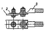5.2.13. Присоединение гибких проводов к плоским контактным выводам аппаратов на тяговых подстанциях должна выполняться с помощью аппаратных и ответвительных прессуемых зажимов (рис. 51) и, как исключение, - с помощью аппаратных болтовых зажимов (рис. 52). Рис. 51. Соединение голых проводов, оконцованных аппаратным и ответвительным прессуемыми зажимами, с контактным выводом аппарата: 1 - контактный вывод аппарата; 2 - зажим аппаратный прессуемый; 3 - зажим ответвительный прессуемый; 4 - медная пластина; 5 - голый провод Рис. 52. Соединение голых проводов, оконцованных аппаратным болтовым зажимом, с контактным выводом аппарата: 1 - контактный вывод аппарата; 2 - зажим аппаратный болтовой; 3 - медная пластина; 4 - голый провод Прессуемые зажимы треста «Армсеть» изготовляются: для медных проводов - из сплава меди, а для алюминиевых проводов - из сплава алюминия. Они имеют одно, два и четыре отверстия для присоединения к контактным выводам аппаратов или шинам. В конструкции зажимов, предназначенных для алюминиевых проводов, предусмотрены переходные медные планки, скрепленные с телом зажимов пайкой или сваркой (на рис. 51 не показаны). Присоединение гибких проводов к стержневым нарезным контактным выводам можно выполнить одним из следующих способов: медные провода присоединяют непосредственно с помощью болтовых или прессуемых аппаратных зажимов, имеющих в лапке зажима одно отверстие, если диаметр стержневого вывода равен 12 мм; медные провода (если диаметр стержневого вывода больше 12 мм) или алюминиевые провода присоединяют через промежуточные медные пластины с помощью болтовых или прессуемых аппаратных зажимов. В этом случае применяются аппаратные зажимы, имеющие в лапке зажима 2 или 4 отверстия. Способ оконцевания голых проводов, присоединяемых к аппаратам, определяется проектом. 5.2.14. Провода в местах установки аппаратных болтовых зажимов должны быть промыты бензином и тщательно очищены стальной щеткой; перед чисткой щеткой алюминиевые провода закрывают вазелином. После очистки вазелин удаляют с проводов тряпкой, смоченной бензином, и заменяют слоем чистого вазелина. Перед закреплением алюминиевых проводов контактные поверхности алюминиевых аппаратных зажимов покрывают слоем вазелина. Затем контактные поверхности слегка обрабатывают напильником для удаления с поверхности пленки окиси. После обработки загрязненный вазелин удаляется с помощью тряпки, смоченной бензином, и заменяется тонким слоем чистого вазелина. Луженые медные желобки, предназначенные для закрепления медных проводов в зажимах, следует промыть бензином и покрыть слоем вазелина. Зачищать шкуркой такие желобки не следует. Провода в зажиме необходимо закреплять следующим образом: заложить провода в соответствующие желобки зажима (при монтаже переходных зажимов с меди на алюминий медный провод должен соприкасаться с луженым медным желобком, а алюминиевый провод - с алюминием), установить плашки, покрыть нарезанную часть болтов морской смазкой марки АМС-1, не допуская попадания ее на контактную поверхность, и затянуть болты. Затяжку болтов гайками следует производить равномерно с тем, чтобы все части зажима испытывали одинаковое давление по длине контакта. После полной затяжки болтов между плашками должен оставаться зазор 3 - 4 мм. Сближение плашек вплотную указыва