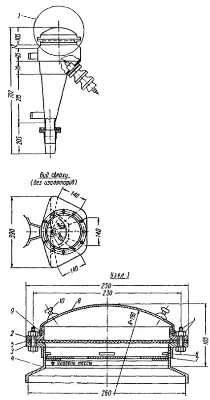 Рис. 90. Концевая овальная воронка: 1 - обмотка тафтяной лентой с подклейкой эпоксидным компаундом, полихлорвиниловой лентой или лентой из лакоткани; 2 - фарфоровая втулка; 3 - корпус воронки; 4 - стальная заземляющая скоба; 5 - болт М8; 6 - гайка М8; 7 - стальная шайба; 8 - полухомутик нижний из тонкой листовой стали; 9 - то же верхний; 10 - заземляющий медный провод; 11 - стальная крышка воронки; 12 - стальная крышка заливочного отверстия Рис. 91. Концевая круглая воронка 5.3.89. При заделке конца кабеля в воронке (рис. 90 и 91 и табл. 23 - 26) ее предварительно протирают чистой тряпкой без ворсин внутри и снаружи, надевают на кабель ниже места разделки и разделывают конец (рис. 92). Жилы кабеля обматывают тафтяной лентой с подклейкой эпоксидным компаундом, полихлорвиниловой лентой или лентой из лакоткани. Рис. 92. Размеры разделки конца силового кабеля для заделки его в воронке: 1 - броня кабеля; 2 - оболочка; 3 - поясная изоляция; 4 - изолированные жилы кабеля; 5 - уровень края воронки; 6 - голая жила Примерив место установки воронки, дополнительно наматывают просмоленную ленту в количестве, необходимом для создания надежного уплотнения при насадке воронки; воронку насаживают, надевают на концы жил фарфоровые втулки, намотав под них предварительно кабельную бумагу, надевают крышку и заливают кабельную массу. После остывания дополнительно доливают кабельную массу до краев воронки и закрывают заливочное отверстие. Таблица 23 Основные размеры овальных воронок для кабелей напряжением 3; 6 и 10 кв