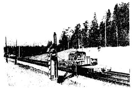 Скорость подъема наибольшего груза....................................... от 0,1 до 10 м/мин Скорость вращения поворотной части..................................... от 0,5 до 2,8 об/мин Скорость передвижения без груза....................................................... 15 км/ч Наибольшая скорость передвижения крана самоходом.................. 14,7 км/ч Характеристика двигателя: СМД-14 четырехтактный, тип........................................................................................... бескомпрессорный число цилиндров................................................................................... 4 мощность............................................................................................ 75 л.с. число оборотов в минуту................................................................... 1700 Габаритные размеры крана: длина в транспортном положении со стрелой длиной 10 м...... 14000 мм высота в транспортном положении................................................ 3885 » наибольшая ширина крана............................................................... 3150 » ширина колеи колес.......................................................................... 2400 » Вес крана со стрелой 10 м.............................................................. 23300 кг Рис. 12. Диаграмма грузоподъемности и схема крана К-161 11. Вертикальный многоковшовый котлованокопатель ВК (рис. 13) Рис. 13. Вертикальный многоковшовый котлованокопатель Техническая характеристика котлованокопателя Мощность двигателя дрезины............................................................... 90 л.с. Скорость передвижения: на первой передаче.......................................................................... 9,5 км/ч на второй передаче............................................................................ 17,9 » на третьей передаче.......................................................................... 31,2 » на четвертой передаче...................................................................... 59,4 » Длина базы машины............................................................................. 5200 мм Вес машины............................................................................................ 18,1 т Производительность в час............................................................... 6 котлованов Вылет рабочего органа от оси пути: наибольший...................................................................................... 6000 мм наименьший....................................................................................... 2700 » Число ковшей.......................................................................................... 20 шт. Емкость одного ковша............................................................................. 20 л Шаг ковшей............................................................................................ 600 мм Скорость движения ковшей............................................................... 0,61 м/сек Скорость движения ленты транспортера............................................... 4 » Скорость подачи рабочего орган....................................................... 0,5 м/сек Размеры отрываемых котлованов: в плане........................................................................................... 660´900 мм глубина.............................................................................................. до 4,6 м 12. Буровая машина (рис. 14) Рис. 14. Буровая машина Техническая характеристика буровой машины Мощность двигателя дрезины............................................................... 93 л.с. Мощность двигателя бурового агрегата................................................. 54 » Максимальная скорость передвижения по перегону........................ 60 км/ч Производительность в час............................................................ 6 - 8 котлованов Вылет рабочего органа: наименьший........................................................................................ 2,7 м наибольший......................................................................................... 5,5 » Максимальная глубина отрываемого котлована от уровня головки рельса......................................................................................... 4,4 м То же с перестановкой гайки................................................................. 4,8 м Диаметр отрываемых котлованов........................................... 500; 600; 700 и 800 мм Вес машины.............................................................................................. 18 т Бу