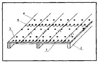 Рисунок 6. 1 - брусок обрешетки, 2 - стропильная нога, 3 - лист Ондулина, 4 - гвозди крепежные, 5 - конвойный элемент Ондулина 2.14. Оформление ендов выполняют до устройства покрытия на скатах крыши с использованием специальных элементов ендов Ондулин. Крепление ендов выполняют к дополнительной обрешетке или сплошному настилу (рис. 7).
