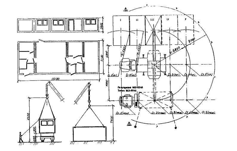 Рисунок 15 - Погрузка и разгрузка зданий контейнерного типа стреловым краном 5.4 Транспортирование мобильных зданийПравила и порядок транспортирования зданий, их особенности, последовательность подготовки к транспортированию, узлы и способы крепления к транспортному средству определяются в прилагаемых заводом инструкциях по эксплуатации. При перевозке здания все пакеты, ящики или кассеты с элементами должны быть надежно закреплены на транспортном средстве с помощью упоров и растяжек. Каждая растяжка должна закрепляться за элементы блок-контейнера и за крепежные детали транспортного средства. Транспортирование мобильных зданий, сооружений автомобильным транспортом осуществляется в зависимости от их габаритных и весовых параметров автотранспортными средствами общего назначения или отнесенных к специализированным. Рекомендуемые автотранспортные средства для перевозки зданий приведены на рисунке 16. Транспортирование зданий, приравненных по параметрам к грузам общего назначения, осуществляется в соответствии с «Правилами дорожного движения Российской Федерации». Перевозка крупногабаритных или тяжеловесных зданий осуществляется в соответствии с «Инструкцией по перевозке крупногабаритных и тяжеловесных грузов автомобильным транспортом по дорогам Российской Федерации» и по специальному разрешению ГИБДД. При перевозке зданий, имеющих высоту над поверхностью проезжей части (включая транспортные средства) более 4,5 метров, маршрут движения автотранспортных средств обязательно согласовывается со службами городского электротранспорта, электросетей и т.д. Все мобильные здания, сооружения и комплекты их элементов подготавливаются к транспортированию. Этот этап в зависимости от особенности конструктивных решений зданий и принятых схем их размещения, крепления и перевозки включают в себя: проверку комплектности, упаковку, укладку и закрепление оборудования, мебели; пакетирования сборно-разборных конструкций и элементов; маркирование, защиту от повреждений и разукомплектования. 5.5 Монтаж и демонтаж мобильных зданийМонтаж (демонтаж) отдельных мобильных зданий и сооружений различного типа и номенклатуры производится согласно требованиям и положениям соответствующего раздела инструкции по эксплуатации, при этом на крупные мобильные объекты вместо принципиальных схем монтажа разрабатываются технологические схемы, с учетом требований СНиП 12-03-2001. Монтаж мобильных зданий и сооружений осуществляется «с колес».