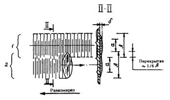 Рис. 2. Продольное перекрытие полос окраски При однопроходном способе материал наносят на поверхность за один проход в одном направлении (вертикальном - сверху вниз или горизонтальном - слева направо или справа налево) с перекрыванием соседнего слоя на 1/4 или 1/2 ширины факела в зависимости от распределения материала в сечении факела. Скорость перемещения пистолета должна составлять 20 - 45 м/мин, что гарантирует "беспотечность" слоя. Этот способ требует повышенного внимания в работе и высокого качества сопла, исключающего наличия "усов" (локальной повышенной концентрации материала в сечении факела).