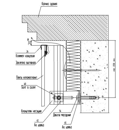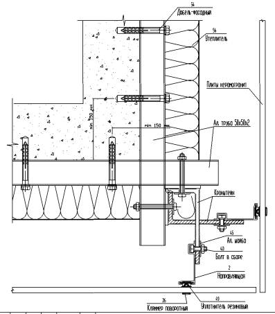 После разметки здания, в местах предусмотренных проектом устанавливаются направляющие 1, 2 и кронштейны. Кронштейны крепятся к стене при помощи различных устойчивых к коррозии анкеров, в зависимости от материала несущей стены. Крепление осуществляется через алюминиевую шайбу АВ 10 которая увеличивает прочность Зонного узла.