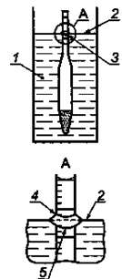 1 - жидкость; 2 - горизонтальная плоская поверхность жидкости; 3 - нижняя часть мениска; 4 - место считывания шкалы; 5 - мениск Рисунок 2 - Считывание показаний шкалы ареометра при испытаниях непрозрачных жидкостей 10.13. Сразу же после считывания показаний шкалы ареометра осторожно вынимают его из жидкости и перемешивают образец в вертикальном направлении термометром. Записывают значение температуры испытуемого образца, округляя его до 0,1°С. Если эта температура отличается от температуры, считанной в начале испытаний, более чем на 0,5°С, повторяют измерения ареометром, а затем термометром до тех пор, пока температура не станет стабильной в пределах ± 0,5°С. Если температура не становится стабильной, помещают цилиндр для ареометра и его содержимое в термостат и последовательно повторяют все действия, начиная с 10.3. 10.14. Если температура испытаний превышает 38°С, дают всем ареометрам типа «свинцовая дробинка в парафине» высохнуть и охладиться в вертикальном положении. 11. Расчет11.1. Вводят поправку в показания термометра (10.13) и записывают значение температуры, округляя его до 0,1°С. 11.2. При испытании непрозрачных жидкостей вводят соответствующую поправку на мениск (таблица 1) в считываемые показания ареометра (10.12), поскольку ареометры калибруют путем считывания на основной поверхности жидкости. Примечание - Поправку для конкретного используемого ареометра определяют по максимальной высоте, отсчитываемой от основной поверхности жидкости по шкале ареометра, на которую поднимается нефтепродукт, когда ареометр погружают в прозрачный нефтепродукт, поверхностное натяжение которого равно поверхностному натяжению испытуемого образца. Что касается ареометров, используемых в настоящем методе, - см. таблицу 1. 11.3. Вводят поправку для ареометра в считываемое с него показание и записывают значение плотности, округляя его до 0,1 кг/м3 (0,0001 г/см3). 11.4. Переводят скорректированные показания ареометра в значения плотности, используя таблицы измерения параметров нефти 53А, 53В или 53D, представленные в ИСО 91-1, в соответствии со свойствами испытуемых продуктов: сырые нефти - 53А; нефтепродукты - 53В; смазочные масла - 53D. Стандартный метод перевода состоит в использовании компьютерных методов, представленных в таблицах измерения параметров нефти (том X) по ИСО 91 -1. Поправку для показаний стеклянного ареометра необходимо ввести в подпрограмму. Если используют распечатанные таблицы, необходимо ввести погрешности, приведенные в списке опечаток в ИСО 91-1. Распечатанные таблицы вводятся непосредственно со считанными показаниями ареометра после введения в случае необходимости поправок на мениск и температуры калибровки (приложение А). Примечание 1 - Для перевода значений плотности, выраженных в килограммах на кубический метр, в соответствующие значения, выражаемые в граммах на кубический сантиметр, делят их на 103. Примечание 2 - Для перевода показаний ареометра из одной единицы измерения в другую используют таблицу 3 либо таблицу 51 по ИСО 91-1. Если ареометр был отградуирован при температуре, не равной 15°С, показания корректируются в соответствии с приложением А. 12. Запись результатовЗаписывают в отчете окончательный результат, округляя его до 0,1 кг/м3 (0,0001 г/см3), при температуре 15°С. 13. Прецизионность13.1. Повторяемость (сходимость)Разность между последовательными р